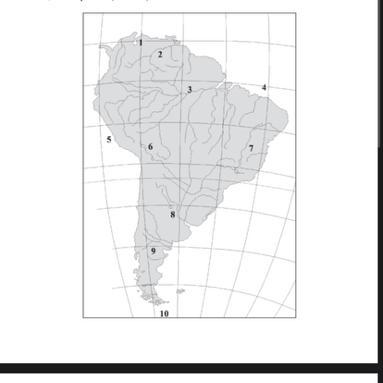4Запишіть об'єкти, позначені на карті цифрами 1-10, при цьому 238 — ріки; 1, 6 - озера; 7, 9 — назви географічних областей; 4 - тепла течія, 5 - холодна течія10 - протока