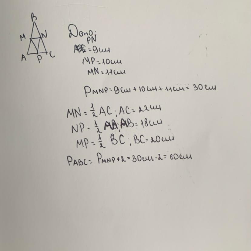 найдите стороны и периметр треугольника, если средние линии треугольника равны 9 см, 10 см и 11 см