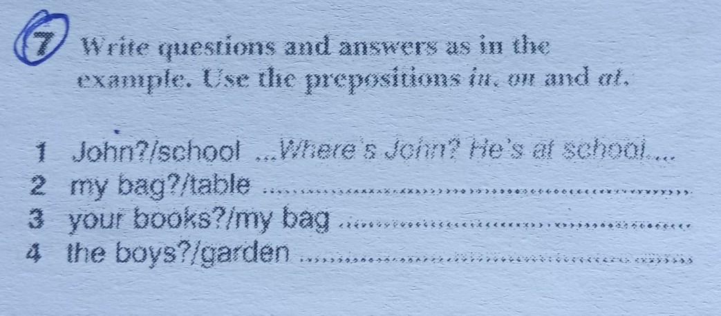 Write questions and answers as in the example. Use the prepositions in, on and at. 1 John?/school ...Where's John? He's at school.... 2 my bag?/table 3 your books?/my bag 4 the boys?/garden career