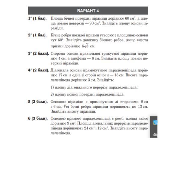 1° (1 бал). Площа бічної поверхні піраміди дорівнює 60 см², а площа повної поверхні 90 см². Знайдіть площу основи піраміди.