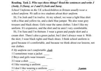 School Uniforms in the UK schoolchildren in Britain usually wear a school uniform. We talk to two students about their uniform Hi, I'm Josh and I'm twelve. At my school, we wear a light blue shirt with a blue and yellow tie, and a dark blue jumper. We also wear grey trousers and black shoes. Girls wear the same clothes. I don't like my uniform. It's expensive, and the shirt and tie aren't very comfortable. Hi, I'm Sara and I'm thirteen. I wear a green and purple skirt and a cream shirt. There's also a green jacket, but I don't always wear it. With the skirt, I wear black tights and black shoes. I think school uniform is good because it's comfortable, and because we think about our lessons, not our clothes. 0 My uniform isn't comfortable. Josh II sometimes wear a jacket 2 Boys and girls wear trousers 31 wear a shirt 4 I like wearing a uniform. 51 don't like wearing a uniform Spaints