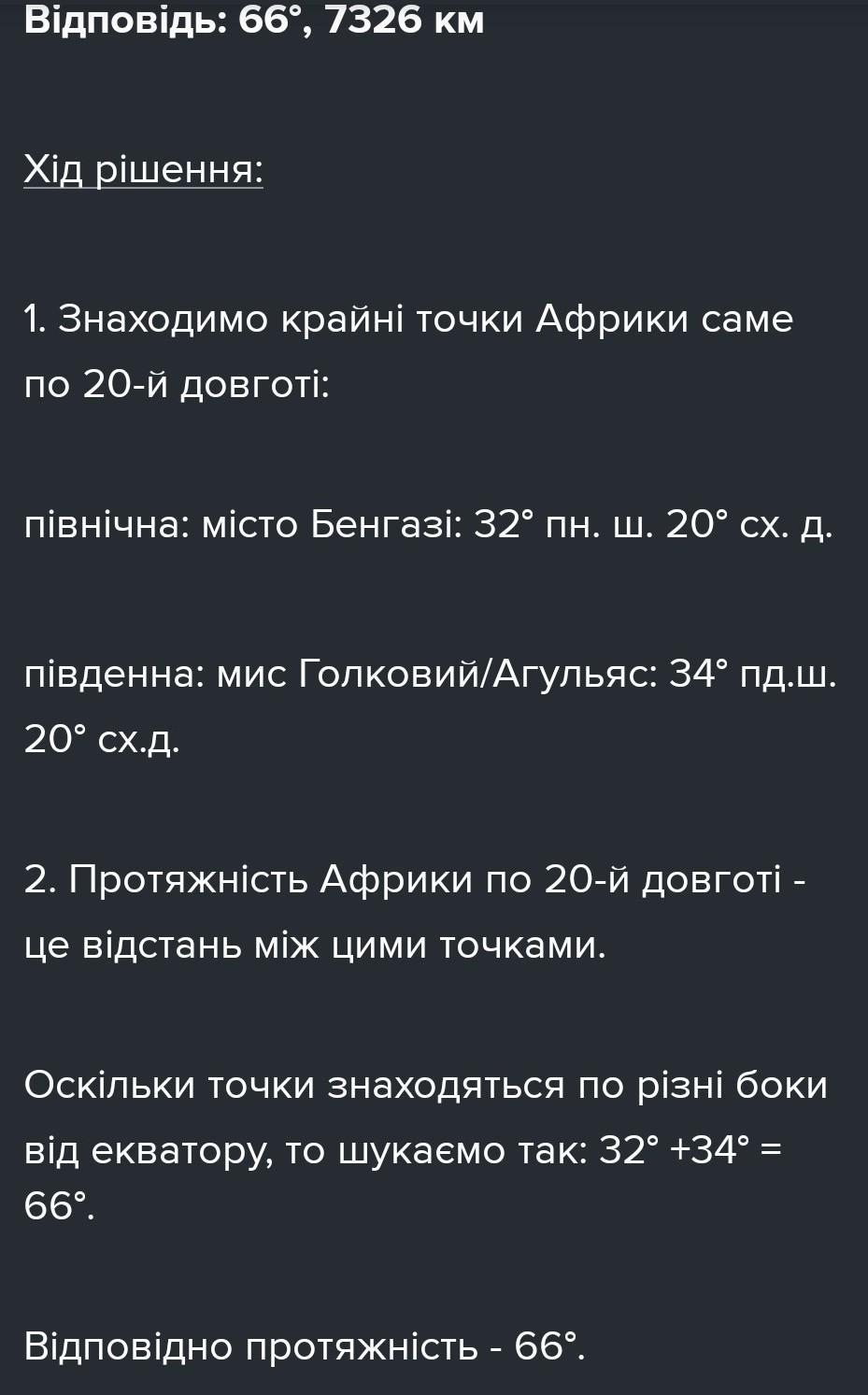Послуговуючись фізичною картою Африки визнач за алгоритмом протяжність материка з півночі на південь вздовж меридіана 20º сх.д; із заходу на схід вздовж паралелі 12º пн.ш. (довжина дуги в 1º на цій паралелі дорівнює 108,9 км)