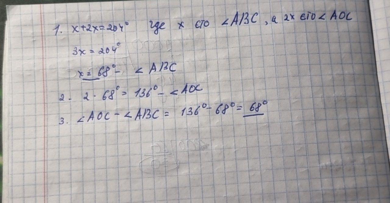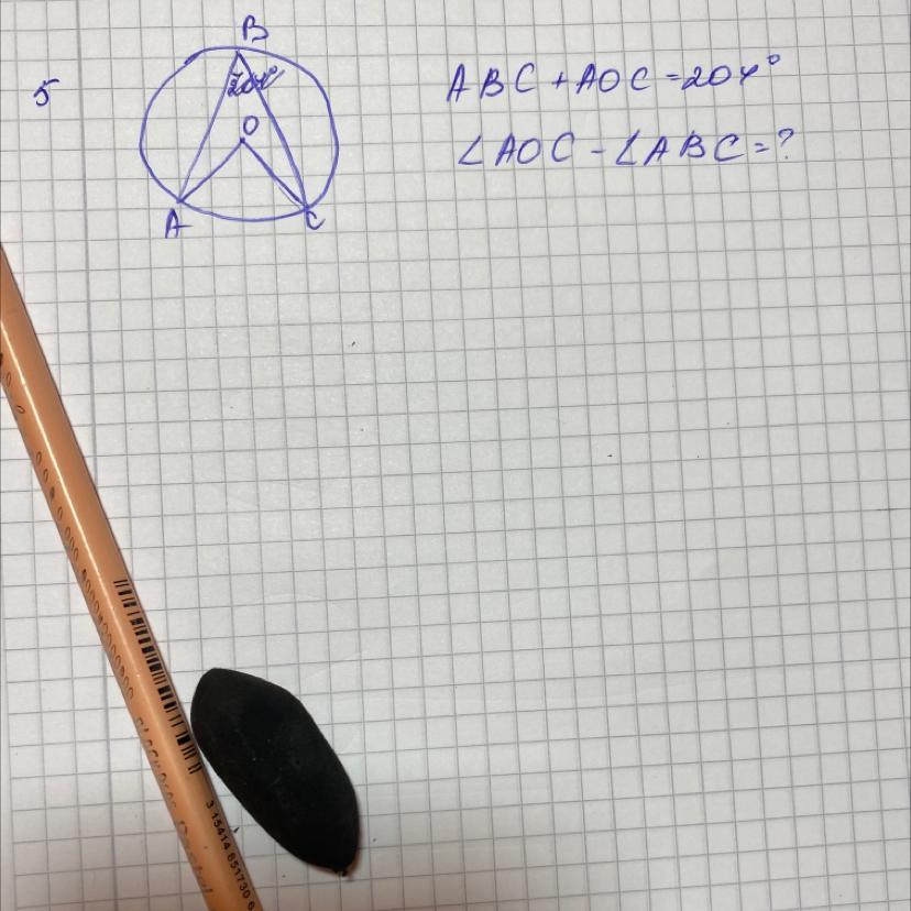 Відповідь: угол, который лежит напротив дуги (угол АВС) равняеться половине дуги, напротив которой он лежит, градусная мера центрального угола (угол АОС) равняеться градусной мере дуги на которой он лежит, соответственно, можно подставить "х" и составить уровнение, решение на фото: