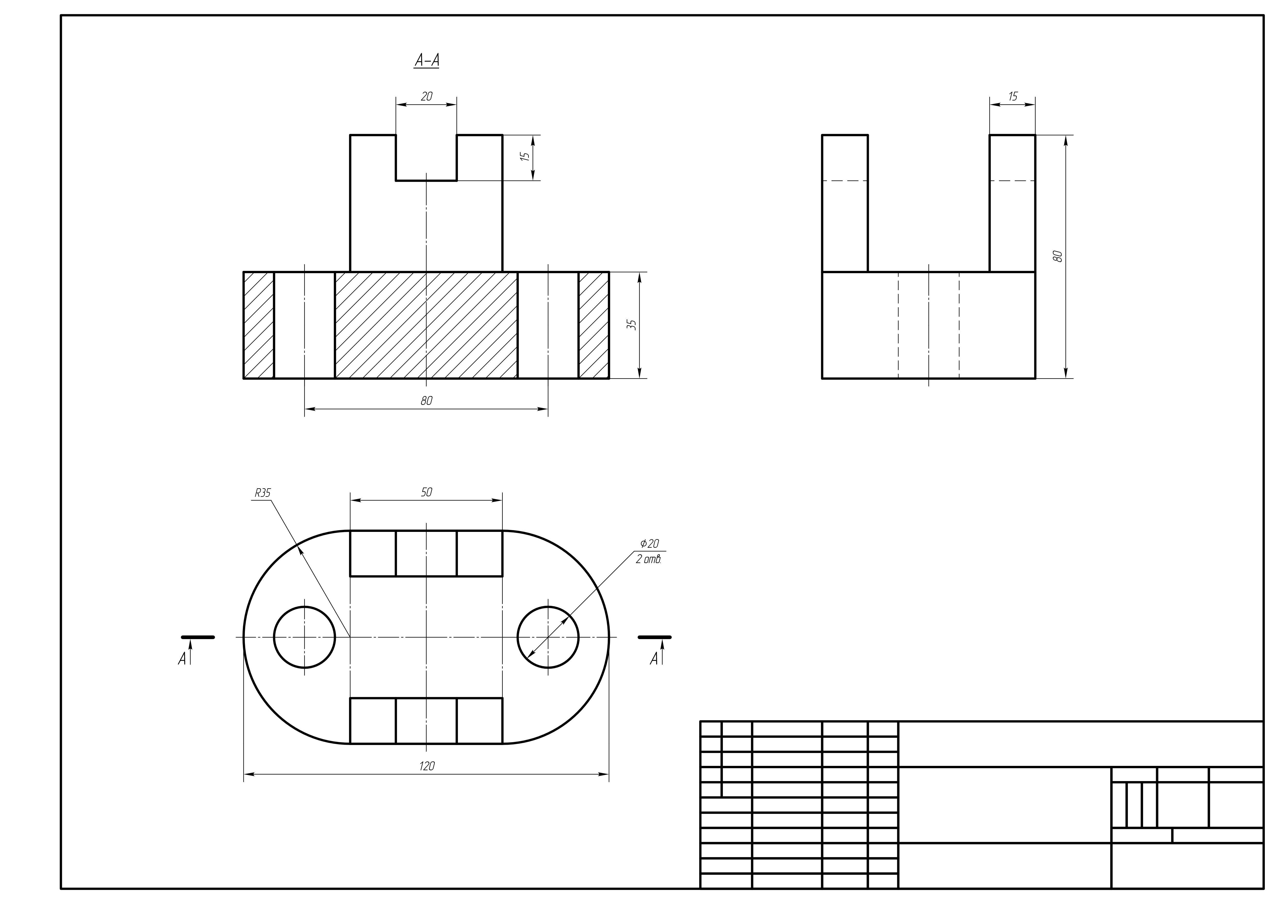 По двум видам (дана фронтальная(вид спереди) проекция и горизонтальная(вид сверху) проекция) построить третий вид (профильная (вид слева) проекция) - ГОСТ 2.305-68. Проставить необходимые размеры ГОСТ 2.307-68 Сделать необходимый разрез - ГОСТ 2.305-68 Построить прямоугольную изометрию – ГОСТ2.317-69.