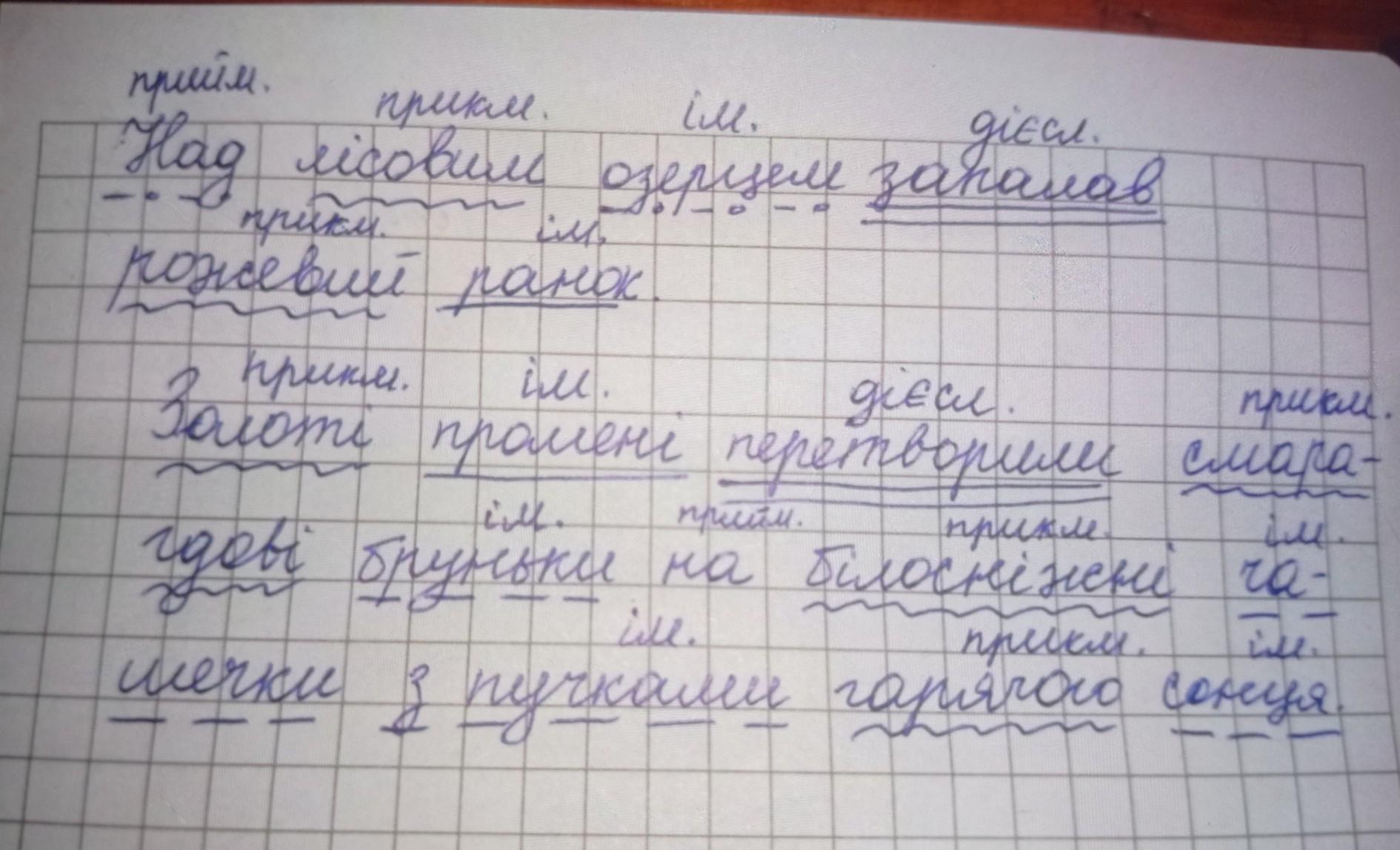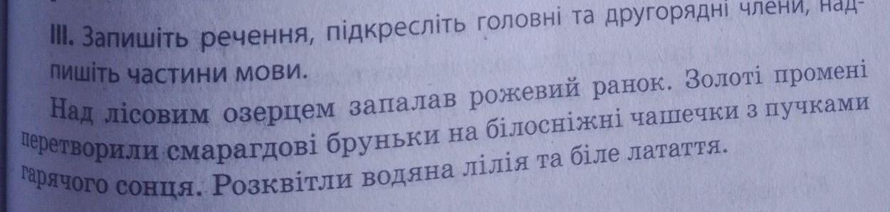 ДУЖЕ ТЕРМІНОВО ,ДОПОМОЖІТЬII. Запишіть речення, підкресліть головнi та другорядні члени, надпишіть частини мови. Над лісовим озерцем запалав рожевий ранок. Золоті промені перетворили смарагдові бруньки на білоснiжнi чашечки з пучками гарячого сонця. Розквітли водяна лілія та біле латаття.