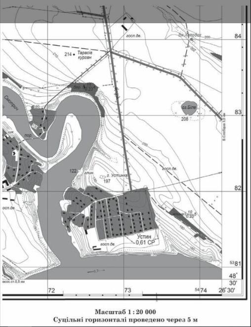 Визначте відносну висоту вершини гори Устинка щодо урізу води в річці Смотрич (у метрах).