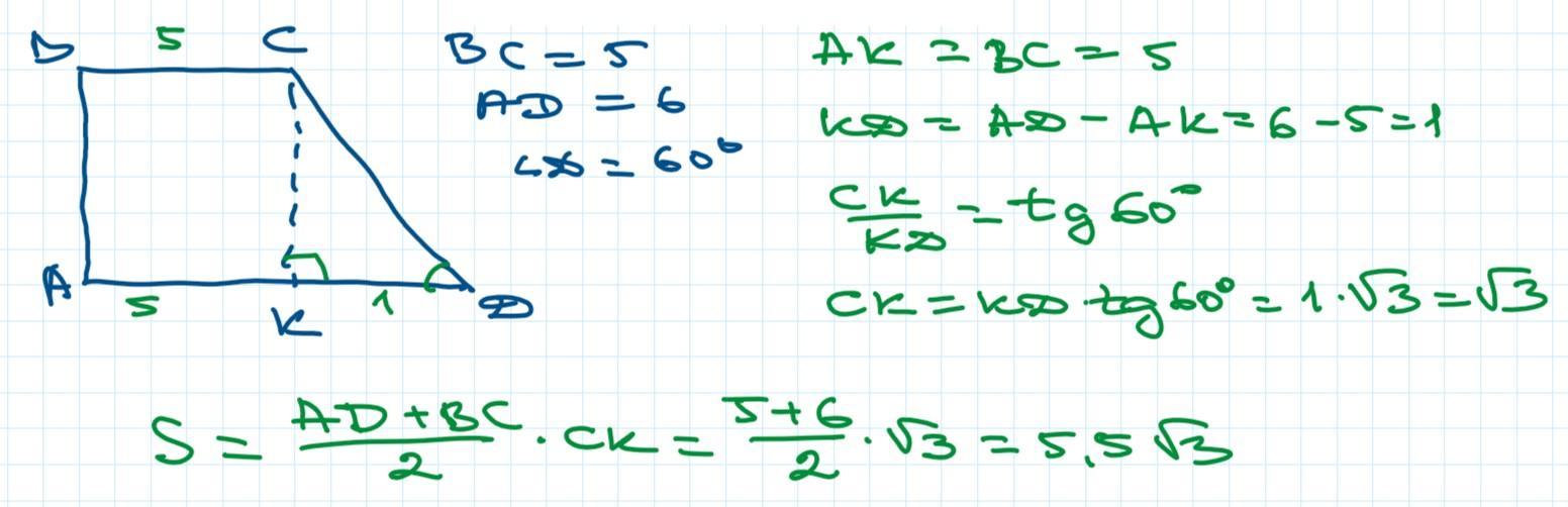 Вычислить площадь прямоугольной трапеции с меньшим основанием 5, большим основанием 6 и острым углом в 60 градусов