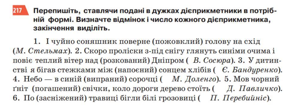 Ответ: 1. I чуйно соняшник поверне пожовкл-у голов-у (однина, Знах.вiдмiн.) на схiд. 2. Скоро пролiски з -пiд снiгу глянуть синiми очима i повiе теплий вiтер над розкован-им Днiпром.(однина, Орудн. вiдмiнок). 3. У дитинствi я бiгав стежками мiж напоен-им сонцем ( однина, Орудн. вiдмiнок) хлiбiв. 4. Небо - в синiй випран-iй сорочцi.( однина, Мiсцевий вiдмiнок). 5. Мов чорний гнiт погашен-оi свiчки ( однина, Родов. вiдм) , коло дороги дерево стоiть. 6. По заснiжен-iй травицi (однина, Мiсцев. вiдм.) бiгли бiлi грозовицi.