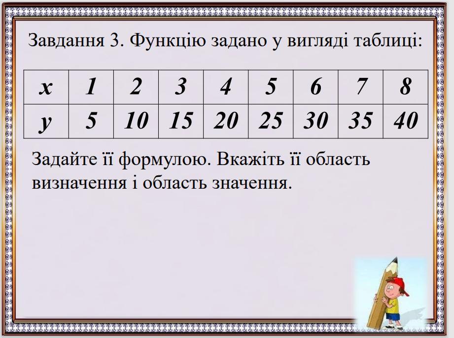 Завдання 3. Функцію задано у вигляді таблиці: х 1 2 3 4 5 6 7 8 у 5 10 15 20 25 30 35 40 Задайте її формулою. Вкажіть її область визначення і область значення