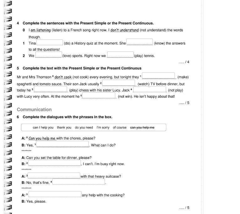 Mr. and Mrs. Thomson 1) don't cook every evening, but tonight they 2) make spaghetti and tomato sauce. Their son Jack usually watches TV before dinner, but today he 2) plays chess with his sister Lucy. Jack 3) doesn't play with Lucy very often. At the moment he 4) doesn't win. He isn't happy about that!