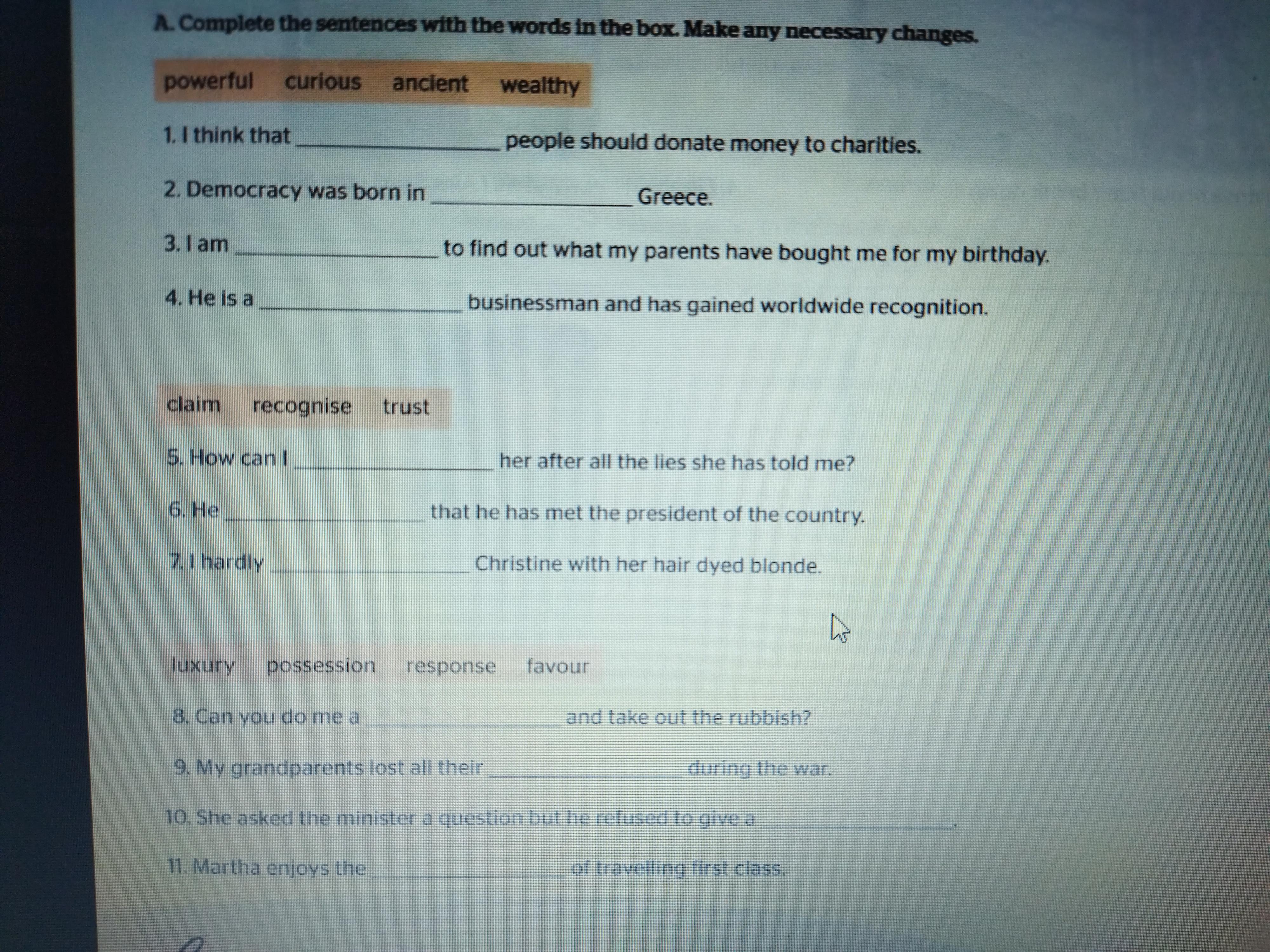 Пояснення: 1. Wealthy 2. Ancient 3. Curious 4.Powerful 5.Recognise 6.trust 7.claim 8.Favour 9.Possession 10.Respond 11.Luxury