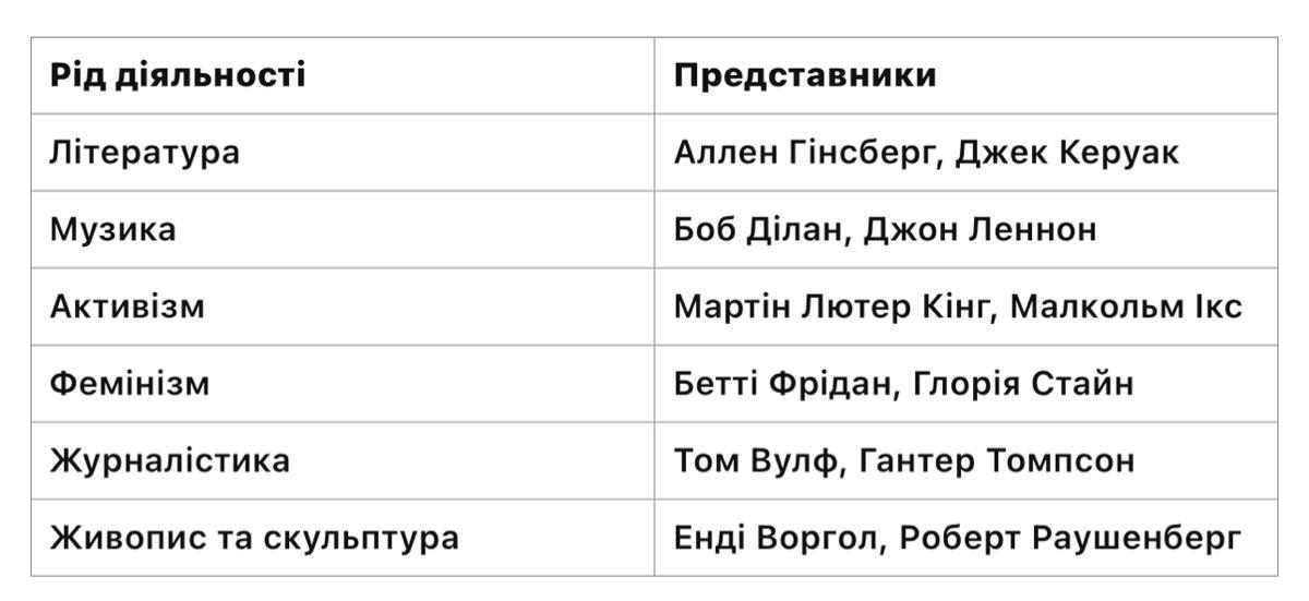 Це лише невеликий перелік представників та їх діяльності, які вплинули на культурні та соціальні аспекти 1960-х років.