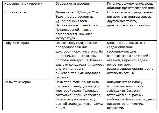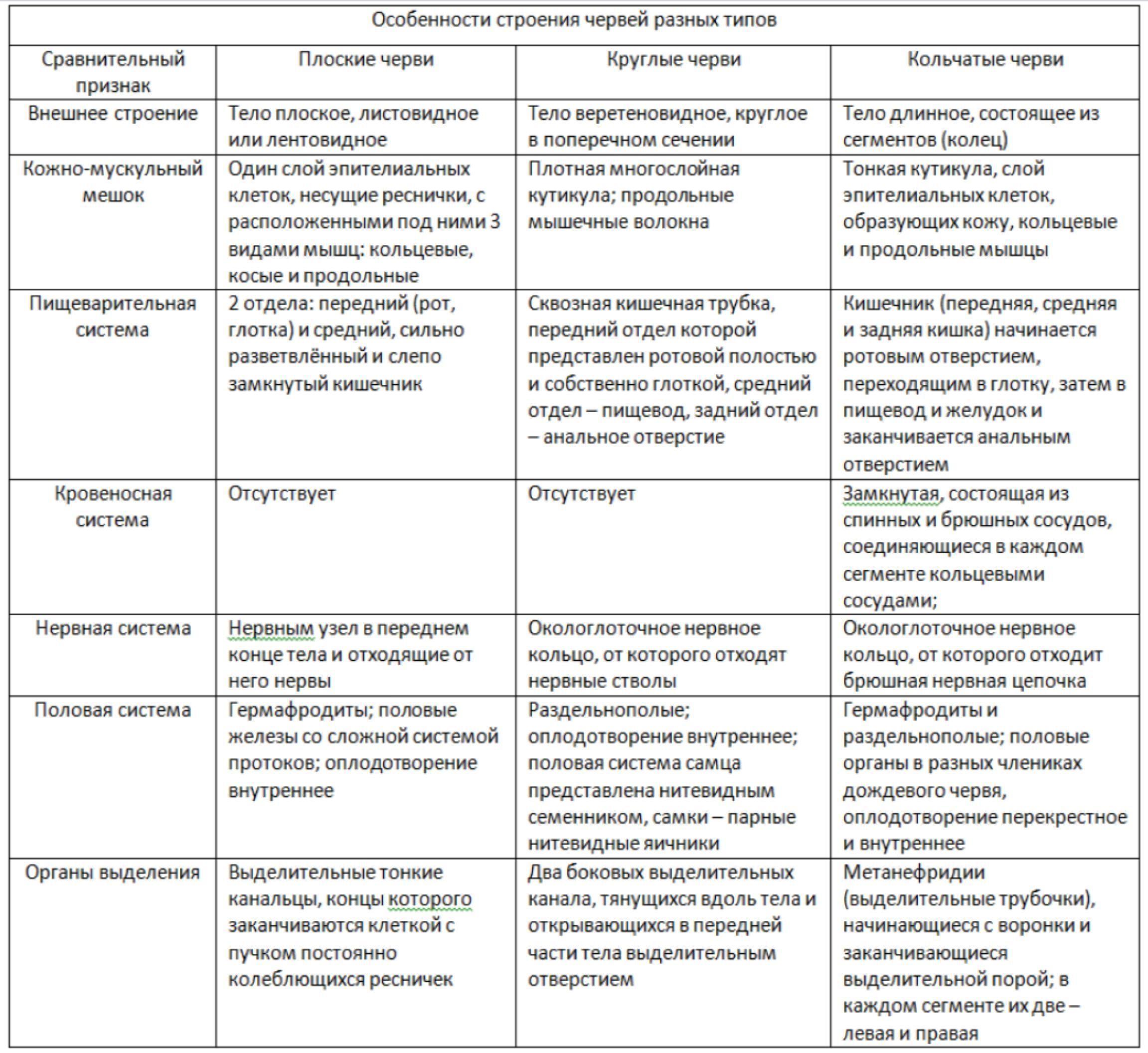 Представители: ресничные черви (планария, многоглазка), сосальщики (печёночная двуустка), ленточные черви (бычий цепень, эхинококк).