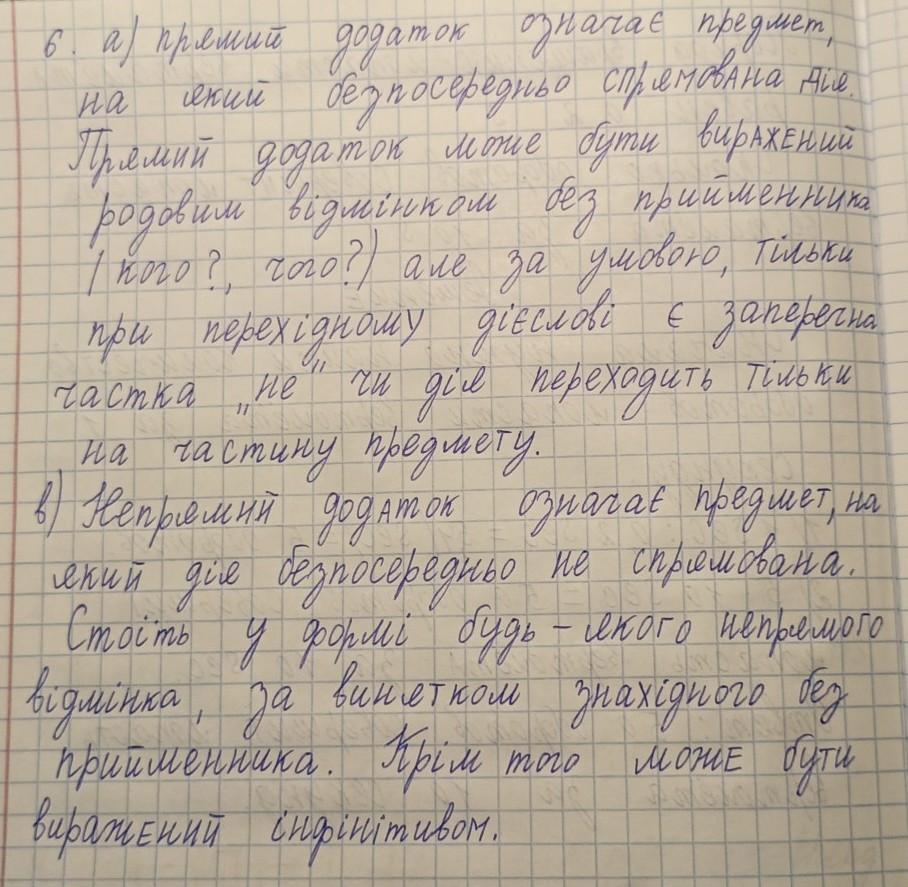в) Непрямий додаток означає предмет, на який дія безпосередньо не спрямована. Стоїть у формі будь-якого непрямого відмінка, за винятком знахідного без прийменника. Крім того може бути виражений інфінітивом.