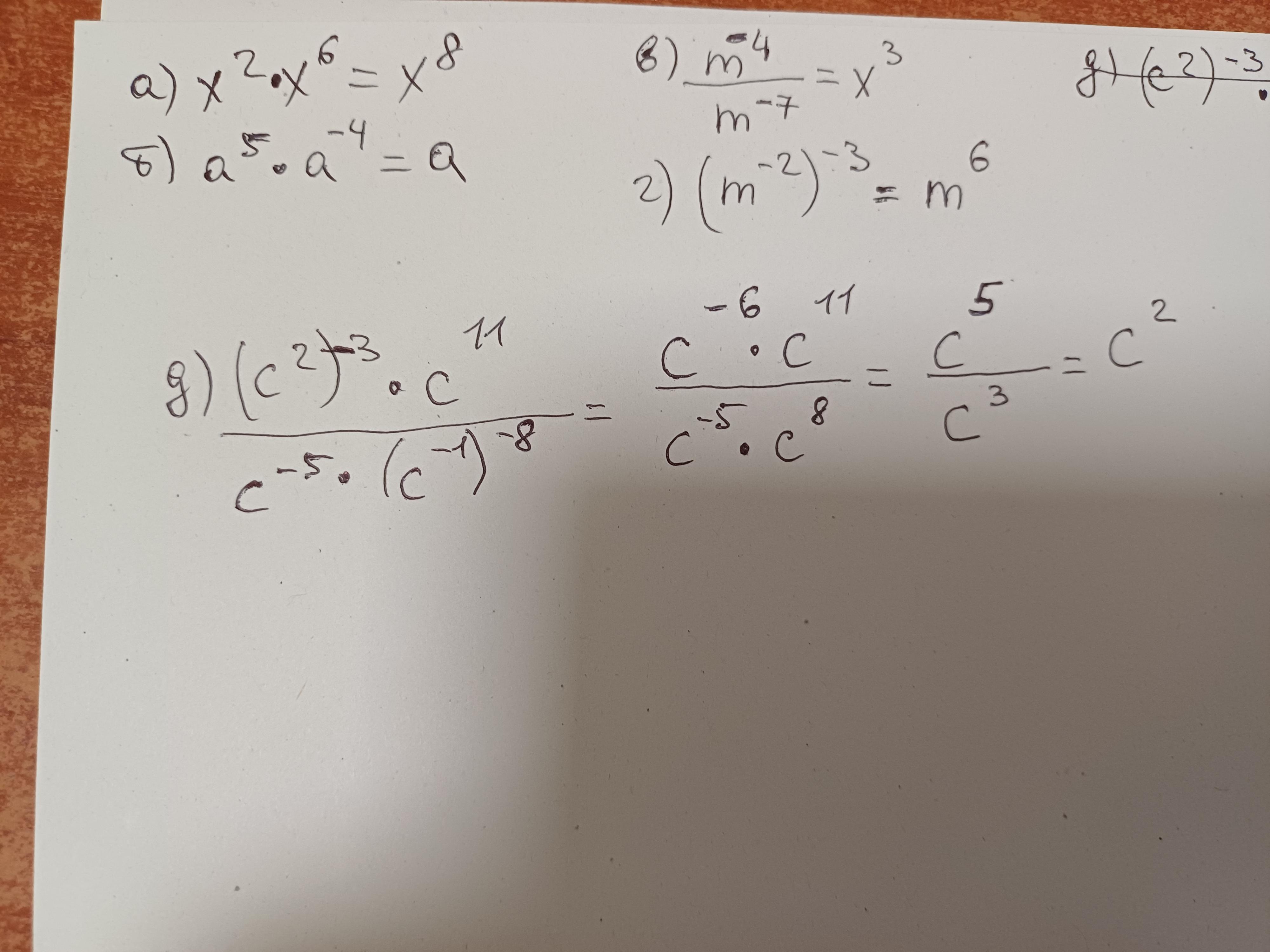 8. представьте в виде степени: а) х^-2*х^6; б) а^-5*а^-4; в) m^-4:m^-7; г) (m^-2)^-3; д) (c^2)^-3*с^11/с^-5*(с^-1)^-8.