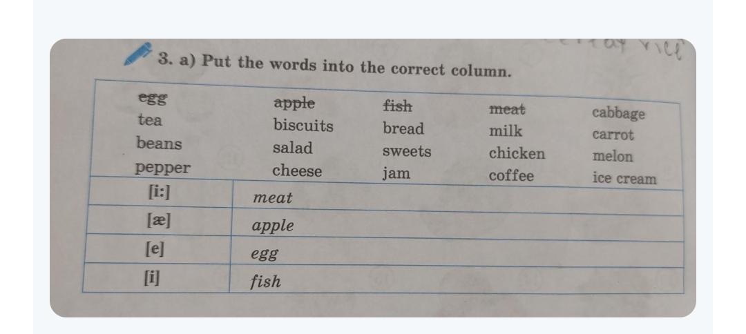 egg tea beans pepper [i:] [æ] 3. a) Put the words into the correct column. apple biscuits [e] [i] salad cheese meat apple egg fish fish bread sweets jam meat milk chicken coffee cabbage carrot meloń ice cream