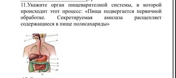 11. Укажите орган пищеварителной системы, в которой этот процесс: «Пища подвергается первичной происходит обработке. содержащиеся Секретируемая амилаза расщепляет в пище полисахариды» 12 доло 11 9 -10