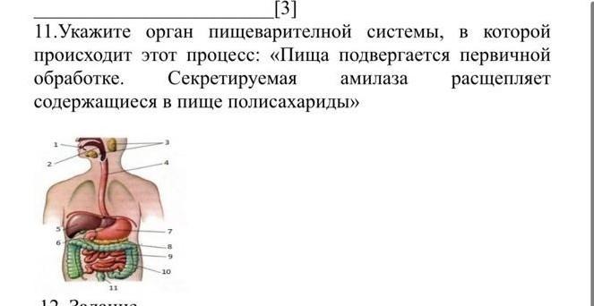 11. Укажите орган пищеварителной системы, в которой этот процесс: «Пища подвергается первичной происходит обработке. содержащиеся Секретируемая амилаза расщепляет в пище полисахариды» 12 доло 11 9 -10