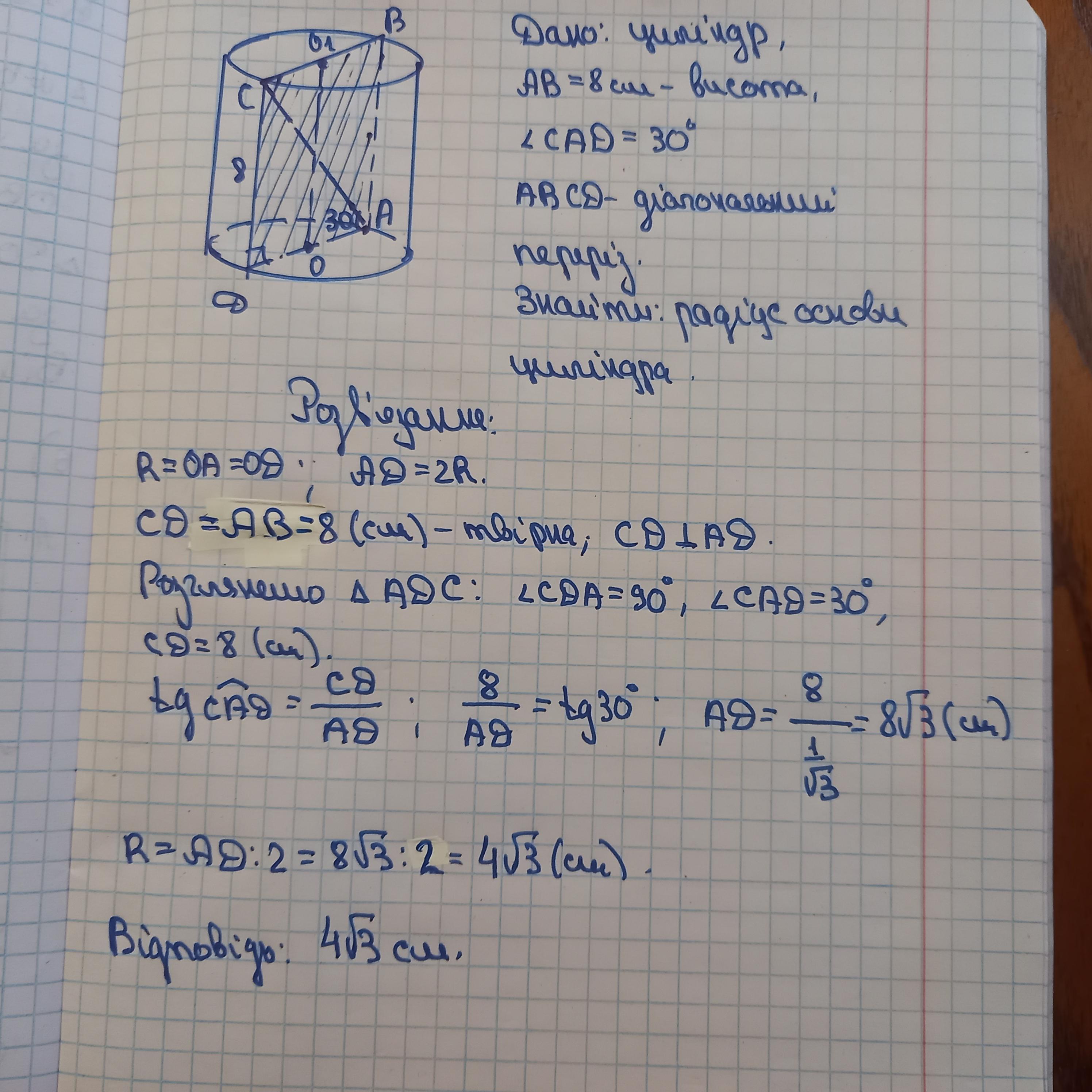 Висота циліндра дорівнює 8см, а діагональ його осьового перерізу утворює з площиною основи кут 30°. Знайдіть радіус циліндра.