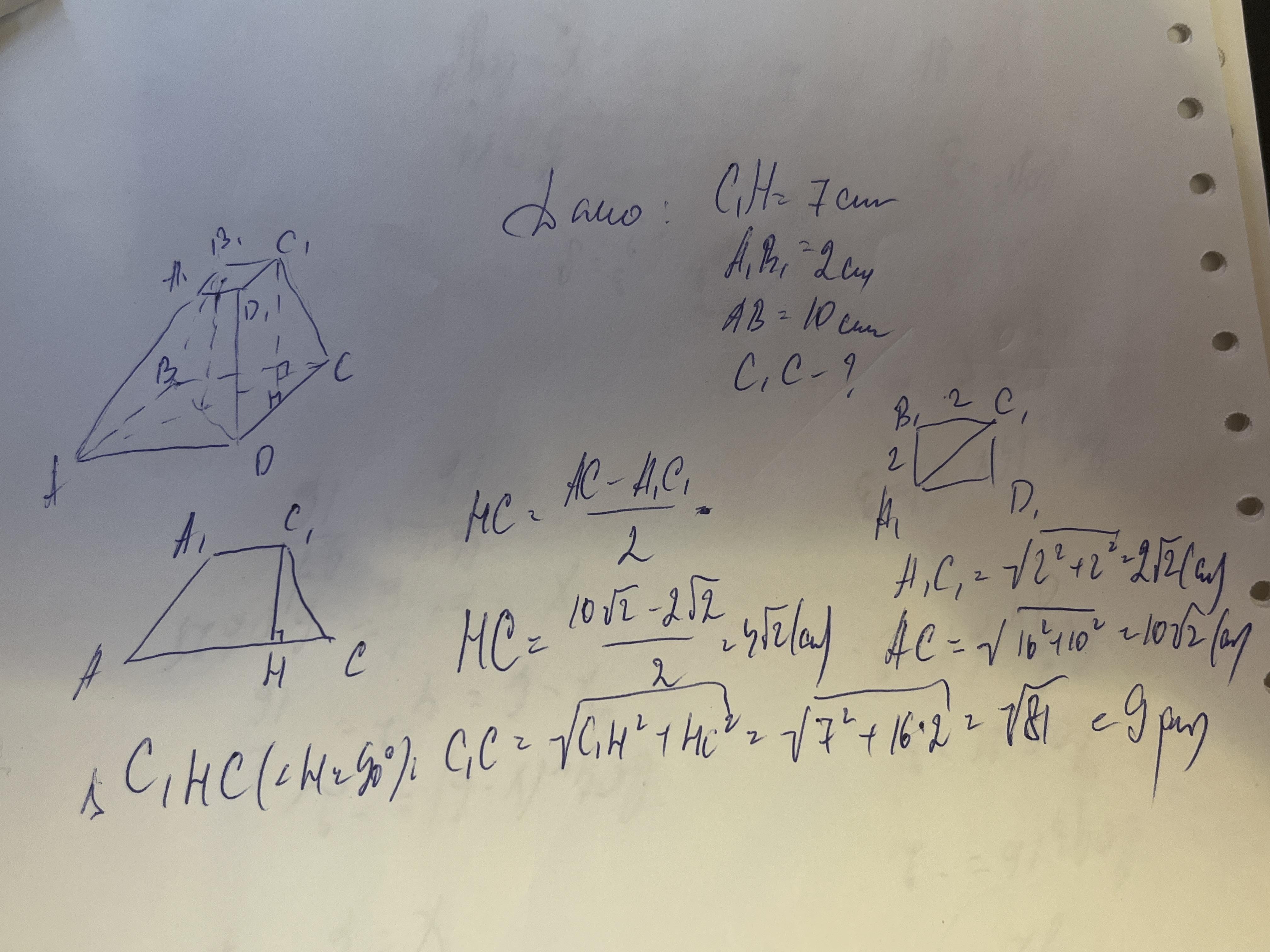 Висота правильної чотирикутної зрізаної піраміди дорівнює 7 см. Сторони основ дорівнюють 10 см і 2 см. Знайдіть бічне ребро піраміди. малюнок і дано, будь ласка