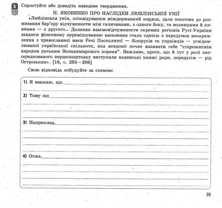 3) Наприклад, фраза з посиланням на роботу Н. Яковенка вказує на той факт, що Люблінська унія сприяла розмиванню кордонів та сприяла об'єднанню українських народів.