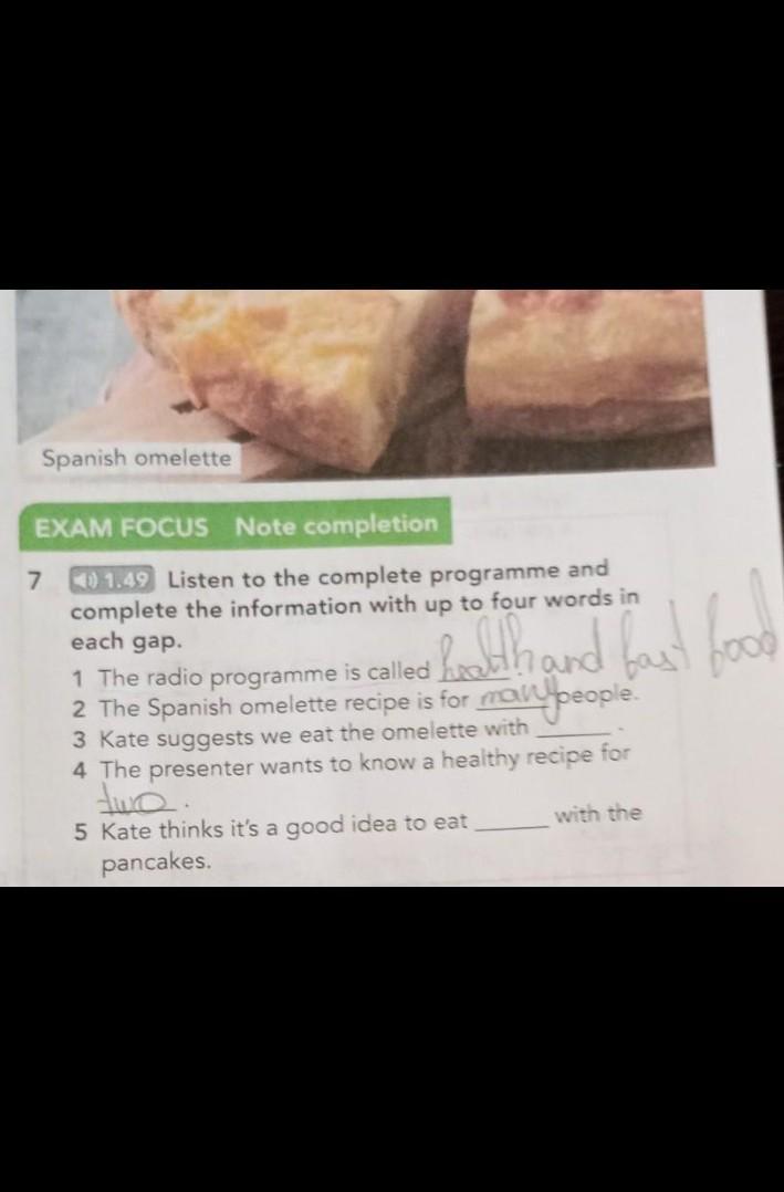 Spanish omelette EXAM FOCUS Note completion 01.49 Listen to the complete programme and complete the information with up to four words in each gap. 7 charth and fast food 1 The radio programme is called 2 The Spanish omelette recipe is for many people. 3 Kate suggests we eat the omelette with 4 The presenter wants to know a healthy recipe for two. 5 Kate thinks it's a good idea to eat with the pancakes.