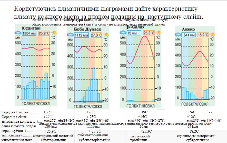 ВИСНОВОК: а) Під час практичної роботи я навчився визначати кліматичні пояси та типи клімату за допомогою поданих у цій роботі кліматограм. Також, навчився визначати причини, що впливають на клімат Африки.