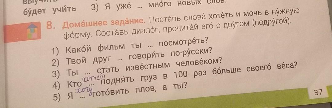 8. Домашнее задание. Поставь слова хотеть и мочь в нужную форму. Составь диалог, прочитай его с другом (подругой). 1) Какой фильм ты посмотреть? 2) Твой друг говорить по-русски? 3) Ты стать известным человеком? comun 4) Кто поднять груз в 100 раз больше своего веса? 5) Я хочу готовить плов, а ты?