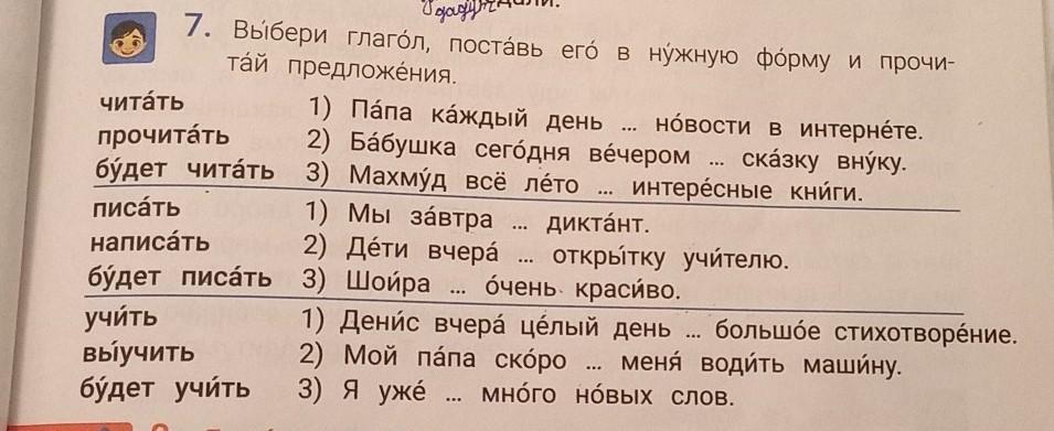 7. Выбери глагол, поставь его в нужную форму и прочи- тай предложения. читать прочитать будет читать писать написать будет писать учить выучить будет учить 1) Папа каждый день 2) Бабушка сегодня вечером 3) Махмуд всё лето 1) Мы завтра новости в интернете. сказку внуку. интересные книги. диктант. *** 2) Дети вчера открытку учителю. 3) Шоира óчень красиво. 1) Денис вчера целый день большое стихотворение. 2) Мой папа скоро меня водить машину. 3) Я уже ... много новых слов.