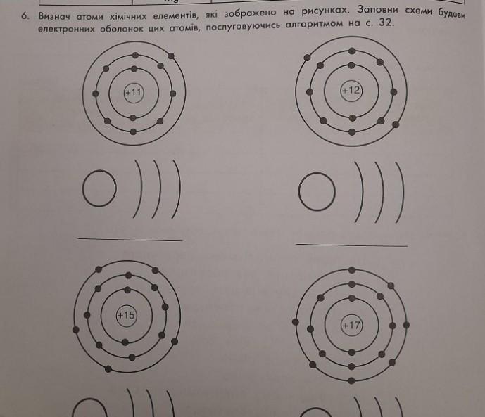 6. Визнач атоми хімічних елементів, які зображено на рисунках. Заповни схеми будови електронних оболонок цих атомів, послуговуючись алгоритмом на с. 32. 0))) (+15) (+12) 0))) (+17)