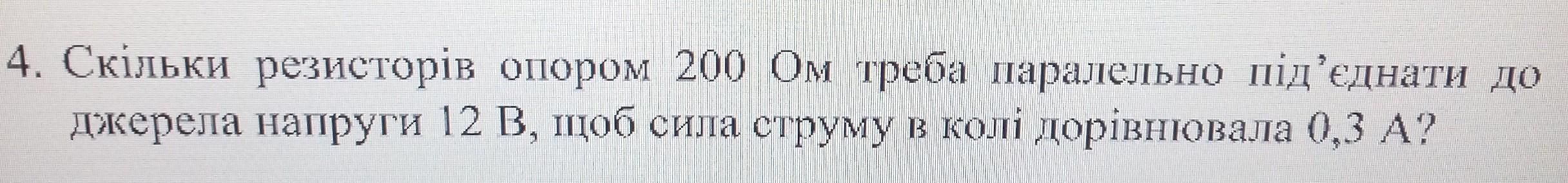 скільки резисторів опором 200 Ом треба паралельно приєднати до джерела напруги 12 В, щоб сила струму в колі дорівнювала 0,3 А??
