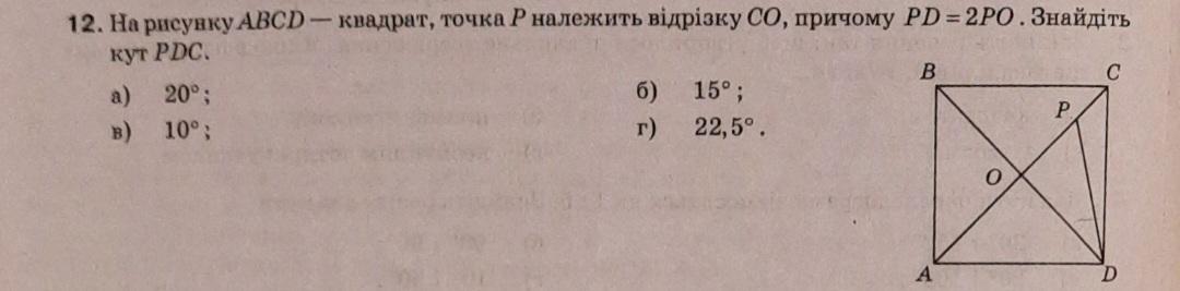 Пояснення: кут PDO=30 як кут навпроти катета, що вдвічі менший за гіпотенузу. кут ODC = 45. кут PDC = 45-30=15