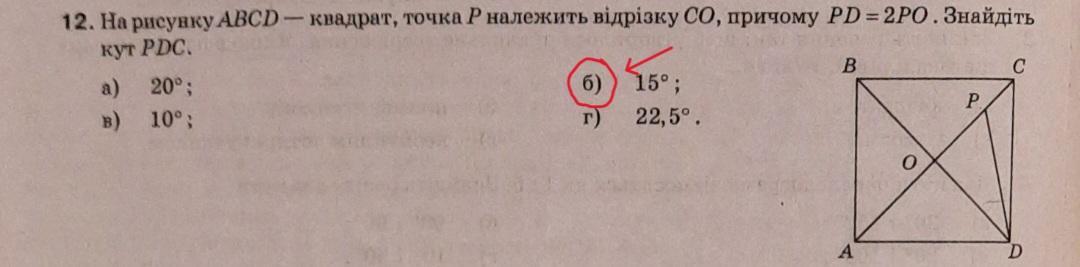 ∠ОР в два раза меньше ∠РD, значит ∠ODP = 30° тогда ∠PDC= 45°- 30°=15°