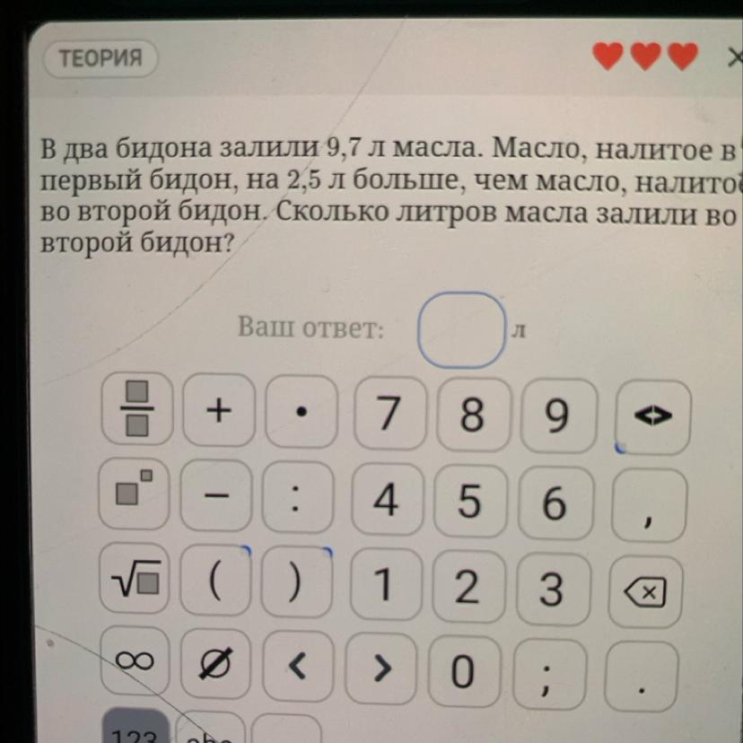 Налили в 1 бидон — (х + 2,5) = 3,6 + 2,5 = 6,1 л масла