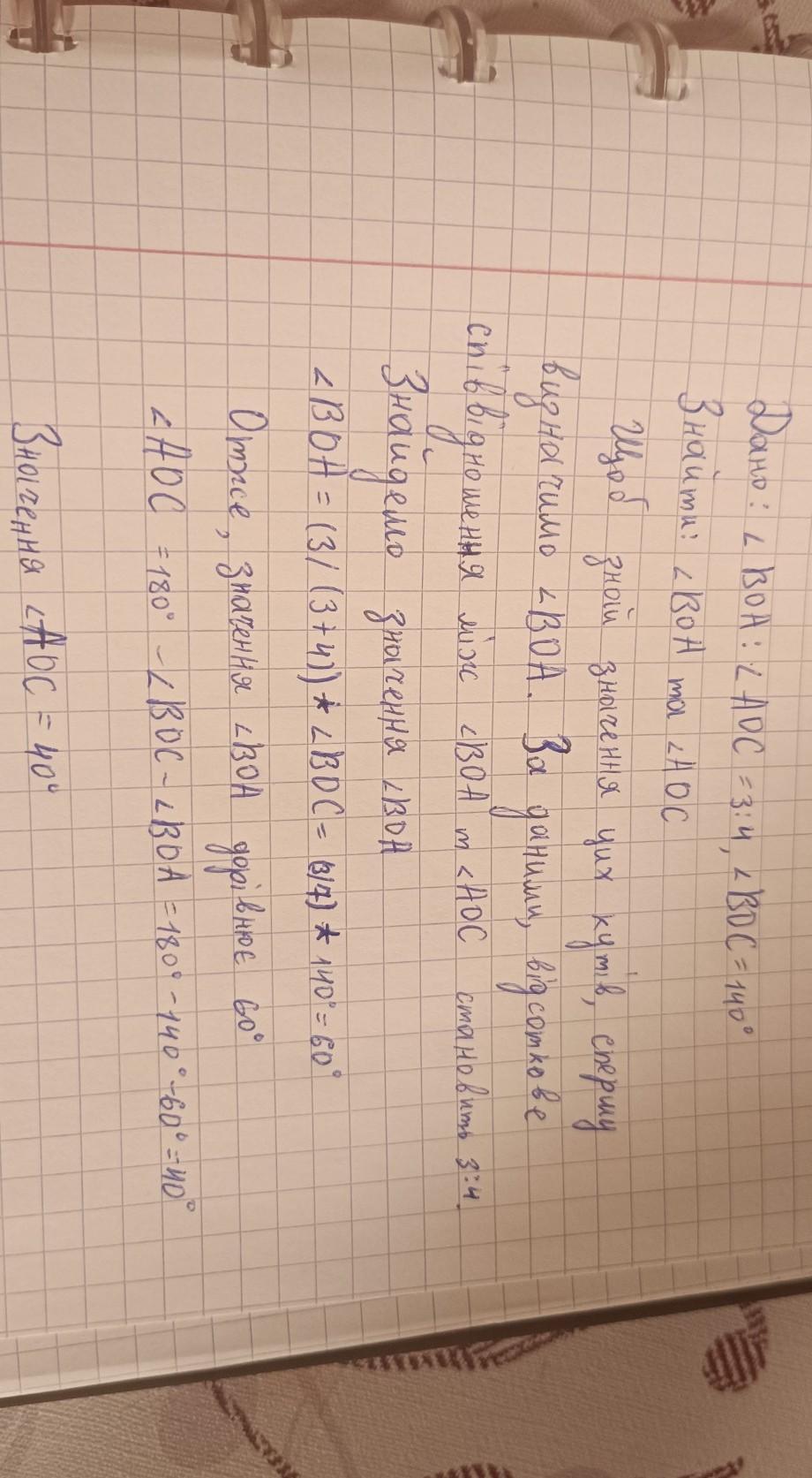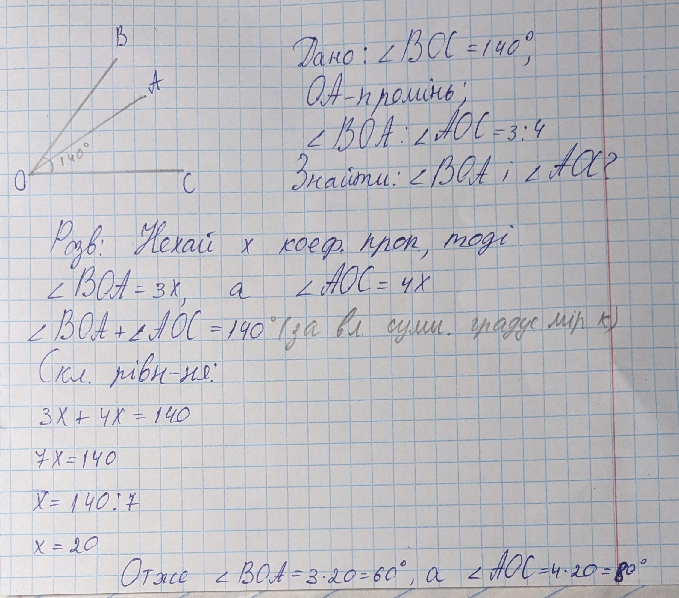 Промінь OA проходить між сторонами кута BOC. Знайдіть ∠BOА та ∠АОС , якщо ∠ВОА : ∠ АОС= 3:4 та ∠ВOC =140°.