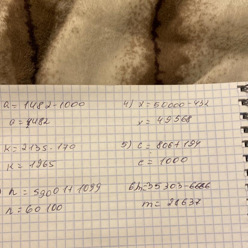 175. Найдите неизвестный компонент действий: 6) 1000+ a = 1482, 2135-k=170, n-59001 - 1099. a) x + 432 = 50 000, c-806 = 194, 35 303-m=6666;