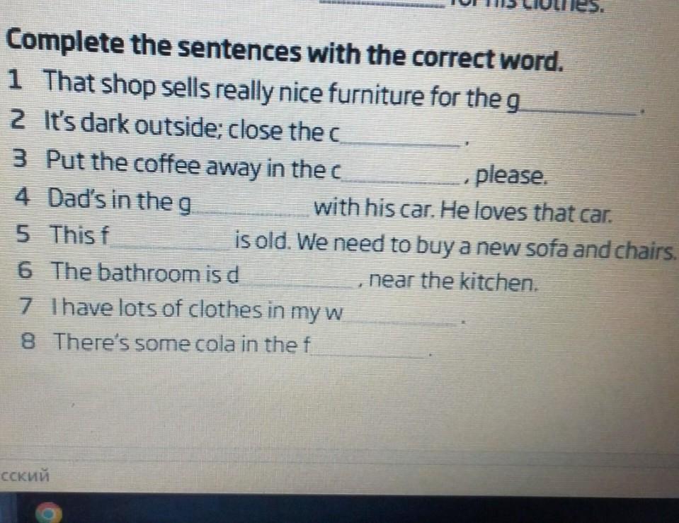 3 Complete the sentences with the correct word. 1 That shop sells really nice furniture for the g 2 It's dark outside; close the c 3 Put the coffee away in the c 4 Dad's in the g 5 This f 6 7 8 русский , please. with his car. He loves that car. is old. We need to buy a new sofa and chairs , near the kitchen. The bathroom is d I have lots of clothes in my w There's some cola in the f