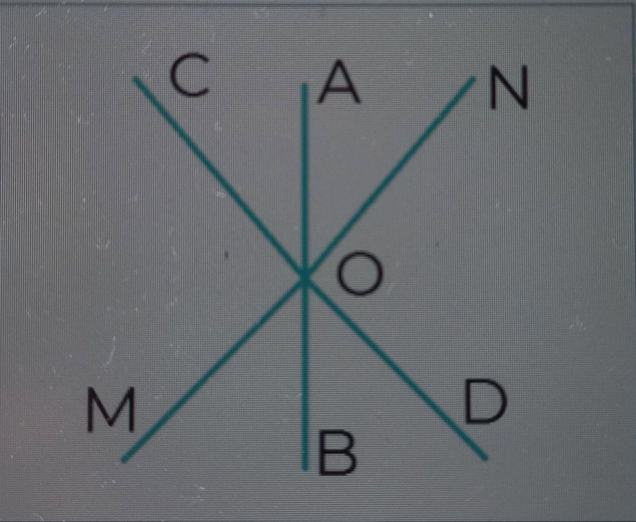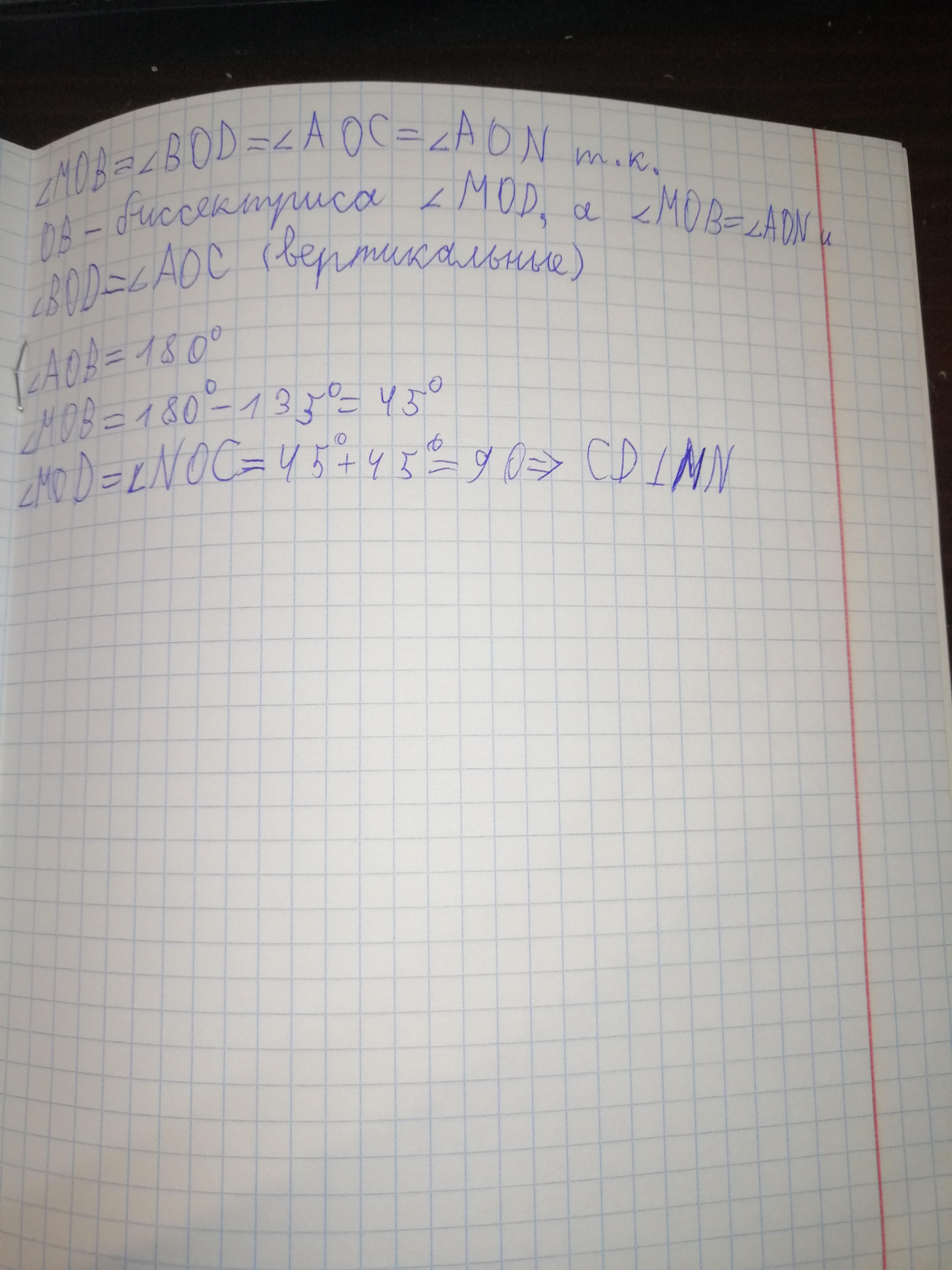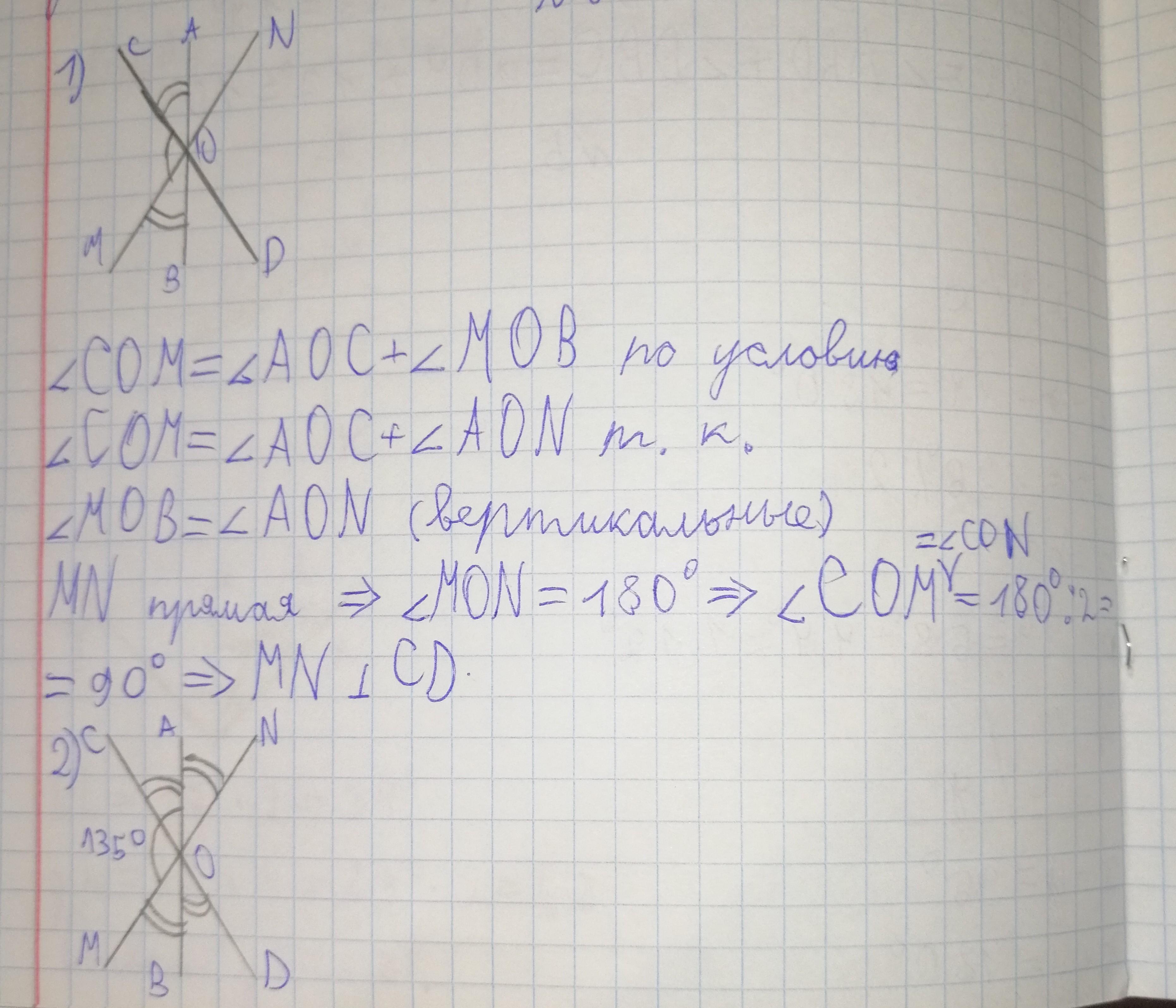 Три прямые AB , CD,MN пересекаются в точке O . Докажите, чтоCD ⊥MN , если: 1) COM∠ = ∠AOC + ∠MOB; 2) ∠AOM = 135° OB, − биссектриса MOD∠.