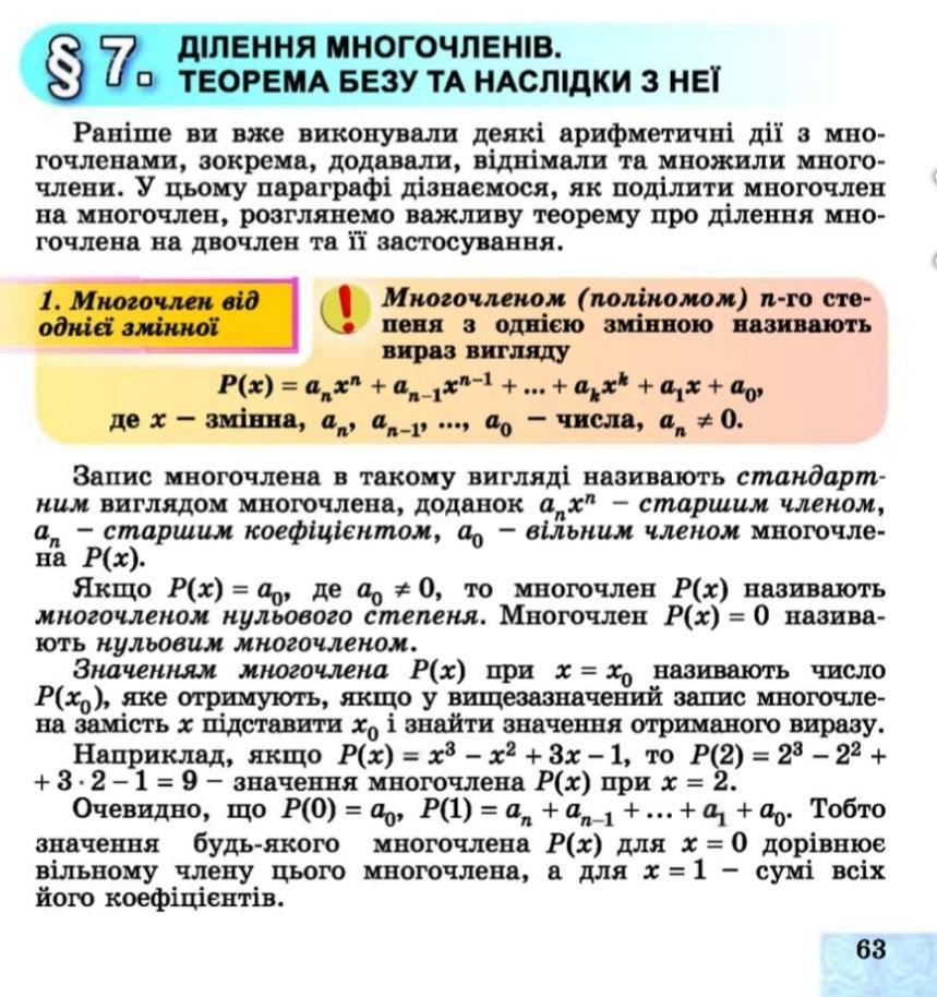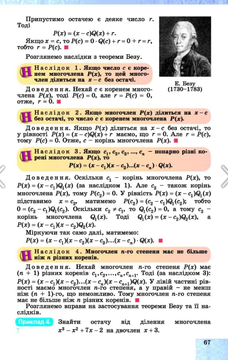 Для цікавості : теорему Безу вивчають в 10 класі поглибленого рівня. Додаю сторінки з підручника Істер О. 10 кл. Алгебра, погл.