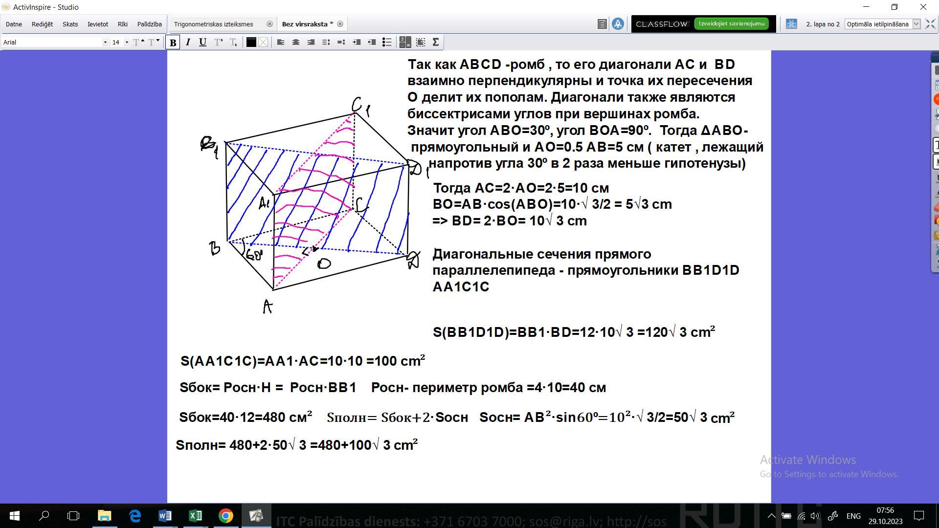 Помогите срочно пожалуйста!!! Основанием прямого параллелепипеда является ромб со стороной 10 см и острым углом 60°. Вычислите площади диагональных сечений параллелепипеда и площадь полной поверхности, если его боковое ребро равно 12 см.