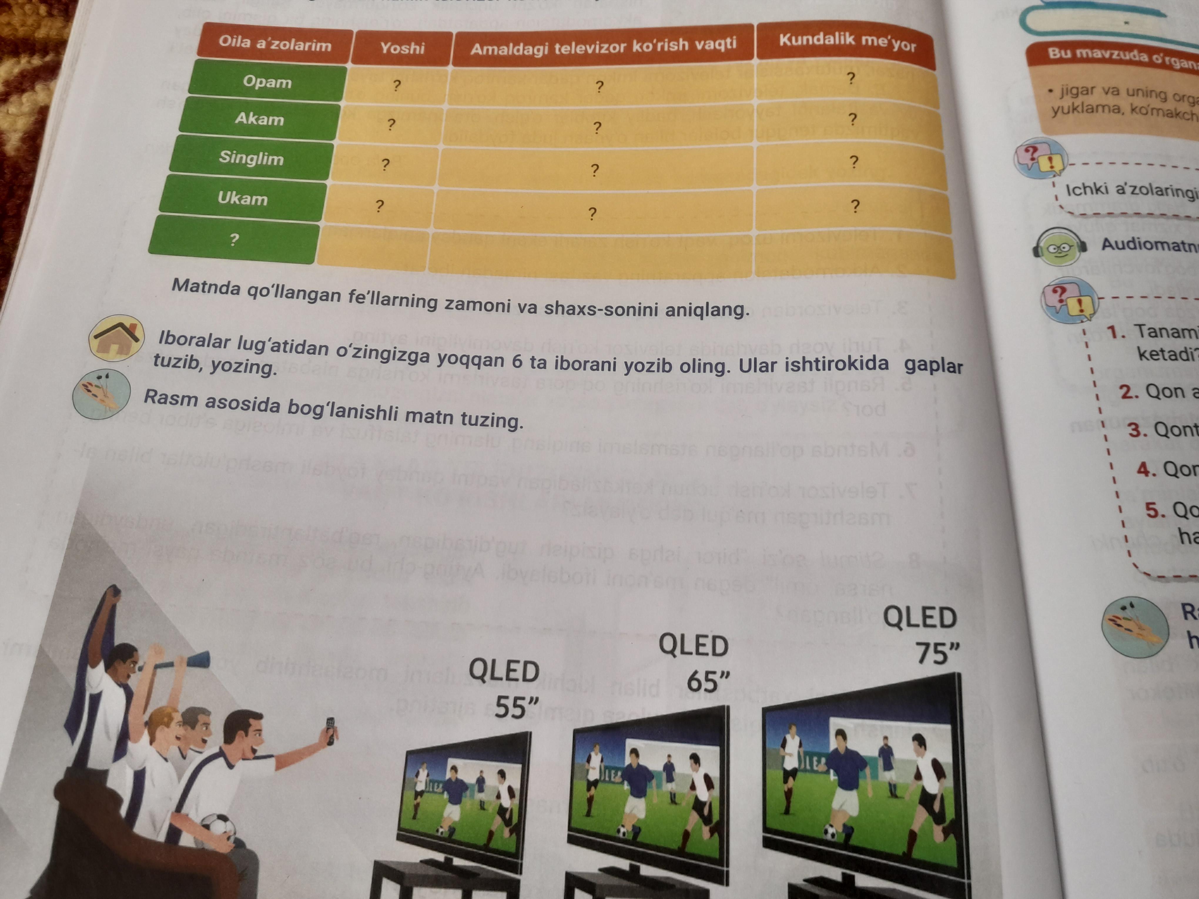 Ответ:1 ойи,2дада,3ака,4опа 1менга ойим йанги куртка олиб бердилар,2дадам бизни хар дам олиш кунлари бувимникига олиб борадилар,3акам мени жуда яхши курадилар,4биз Опам Билан бирга жуда ахилмиз
