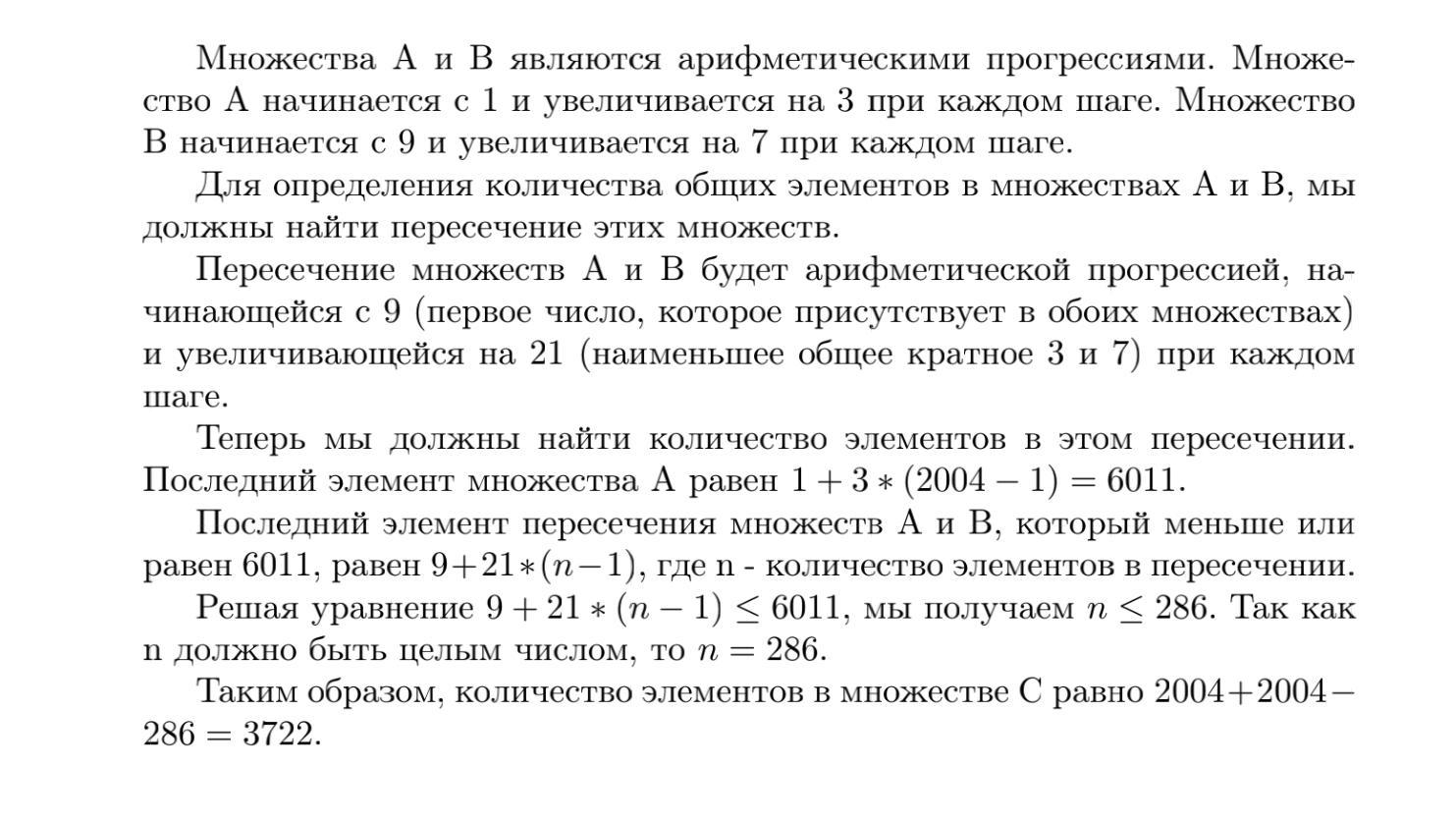 Даны множества A(1,4,7,10,...) и B(9,16,23,30,...), каждое из которых имеет 2004 элемента и продолжается в виде ряда. Множество C — это объединение множеств A и B. Найдите количество элементов множества C.