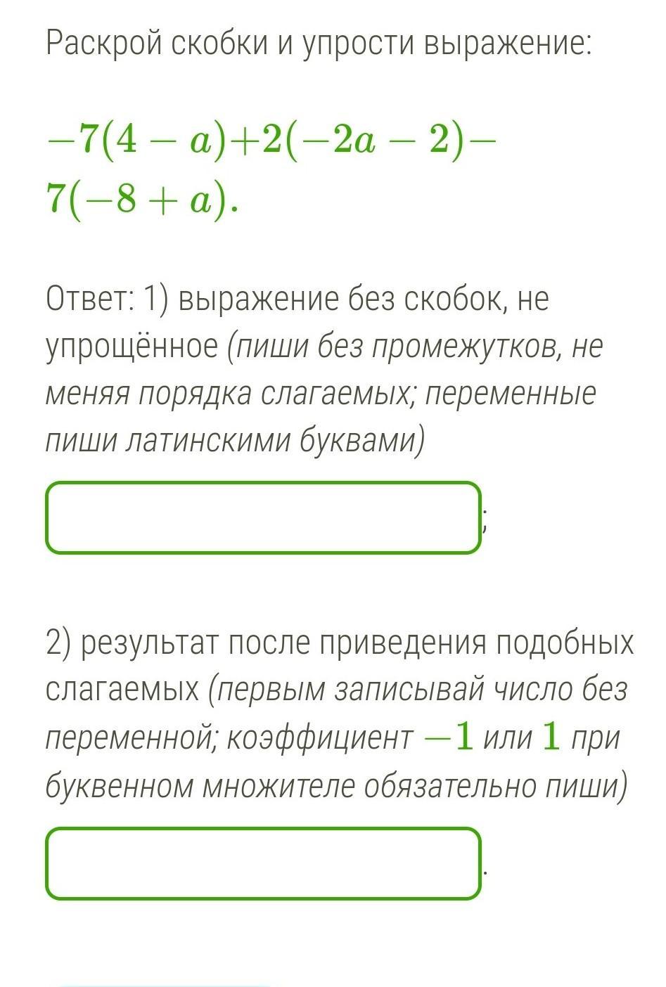 Раскрой скобки и упрости выражение: -7(4- a)+2(-2a - 2)- 7(−8+ a). Ответ: 1) выражение без скобок, не упрощённое (пиши без промежутков, не меняя порядка слагаемых; переменные пиши латинскими буквами) 2) результат после приведения подобных слагаемых (первым записывай число без переменной; коэффициент —1 или 1 при буквенном множителе обязательно пиши)