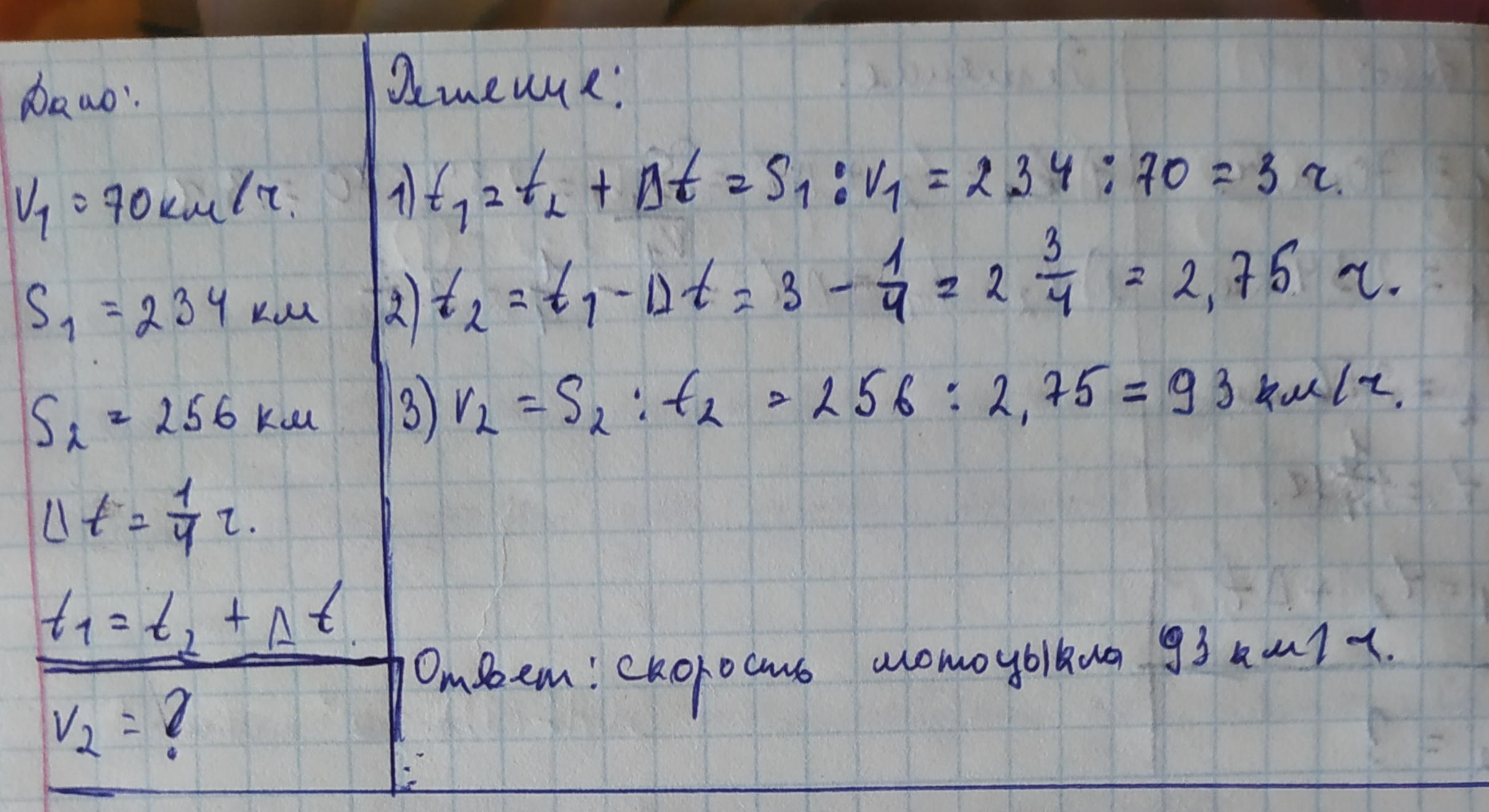 2)Мотоциклист потратил на преодоление 256 км на 1/4 часа меньше, чем потратил автомобиль на преодоление 234 км,тогда: