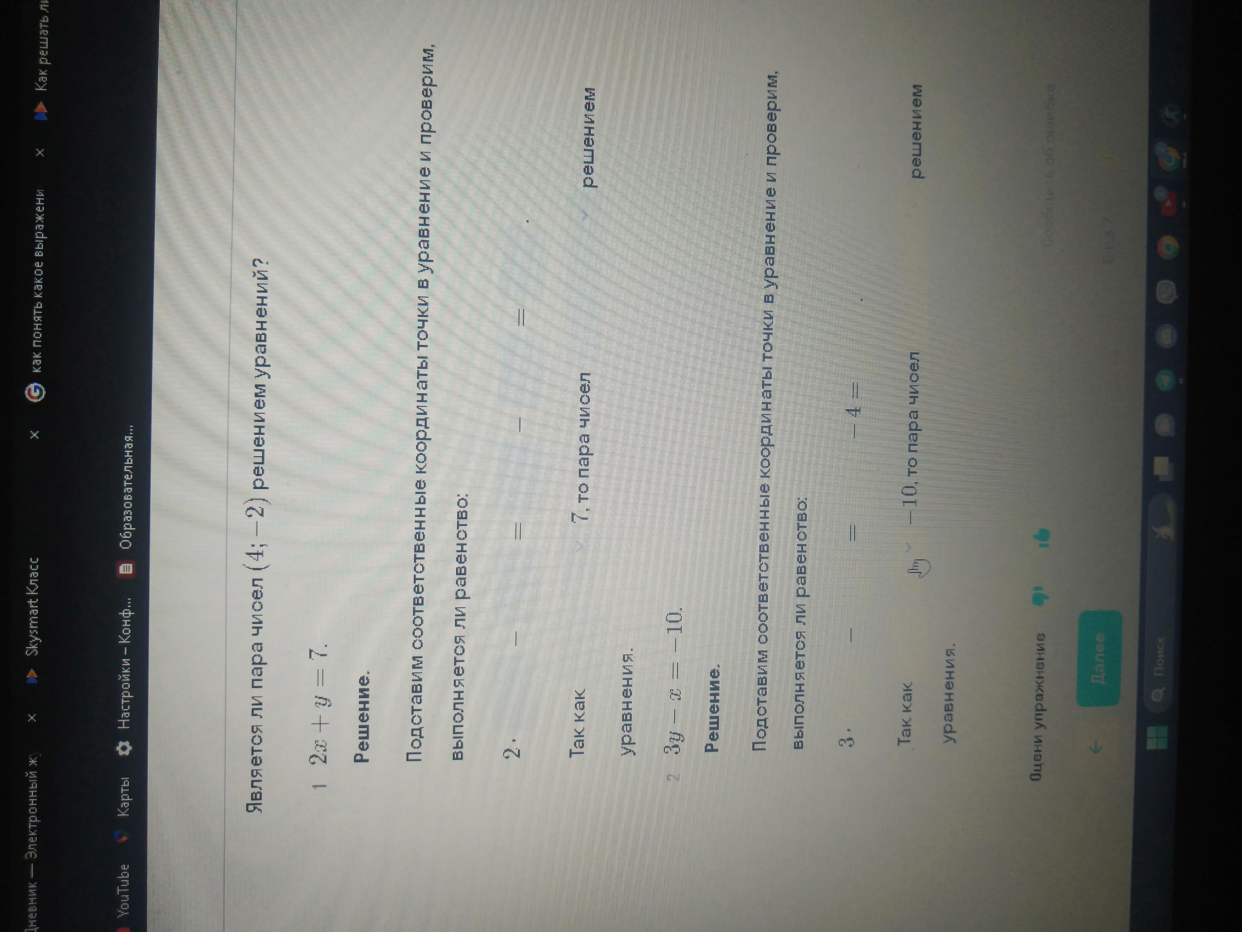 Так как 2х + у = 7, то пара чисел (4; -2) не является решением уравнения.