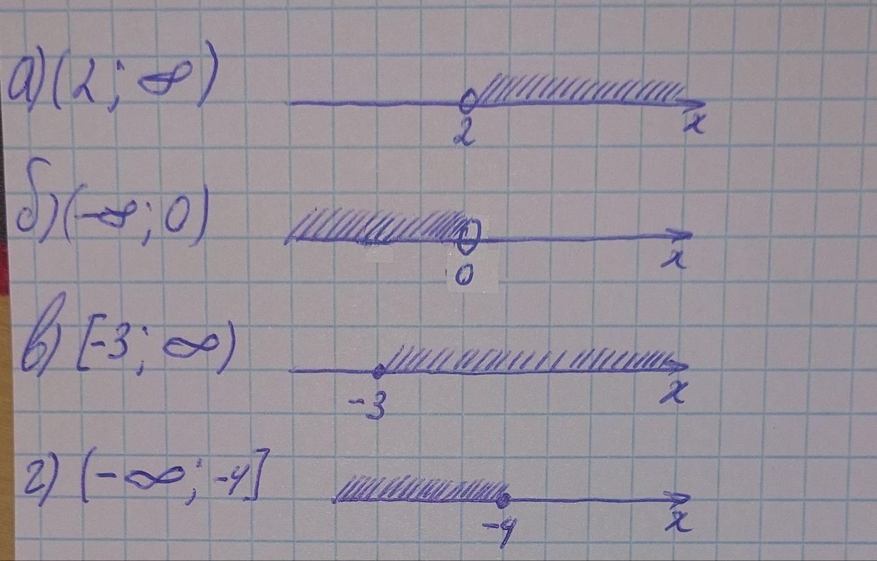 Зобразіть на координатній прямій числовий проміжок: а) (2; ∞); б) (-∞;0); в) [-3; ∞); г) (-∞; -4].