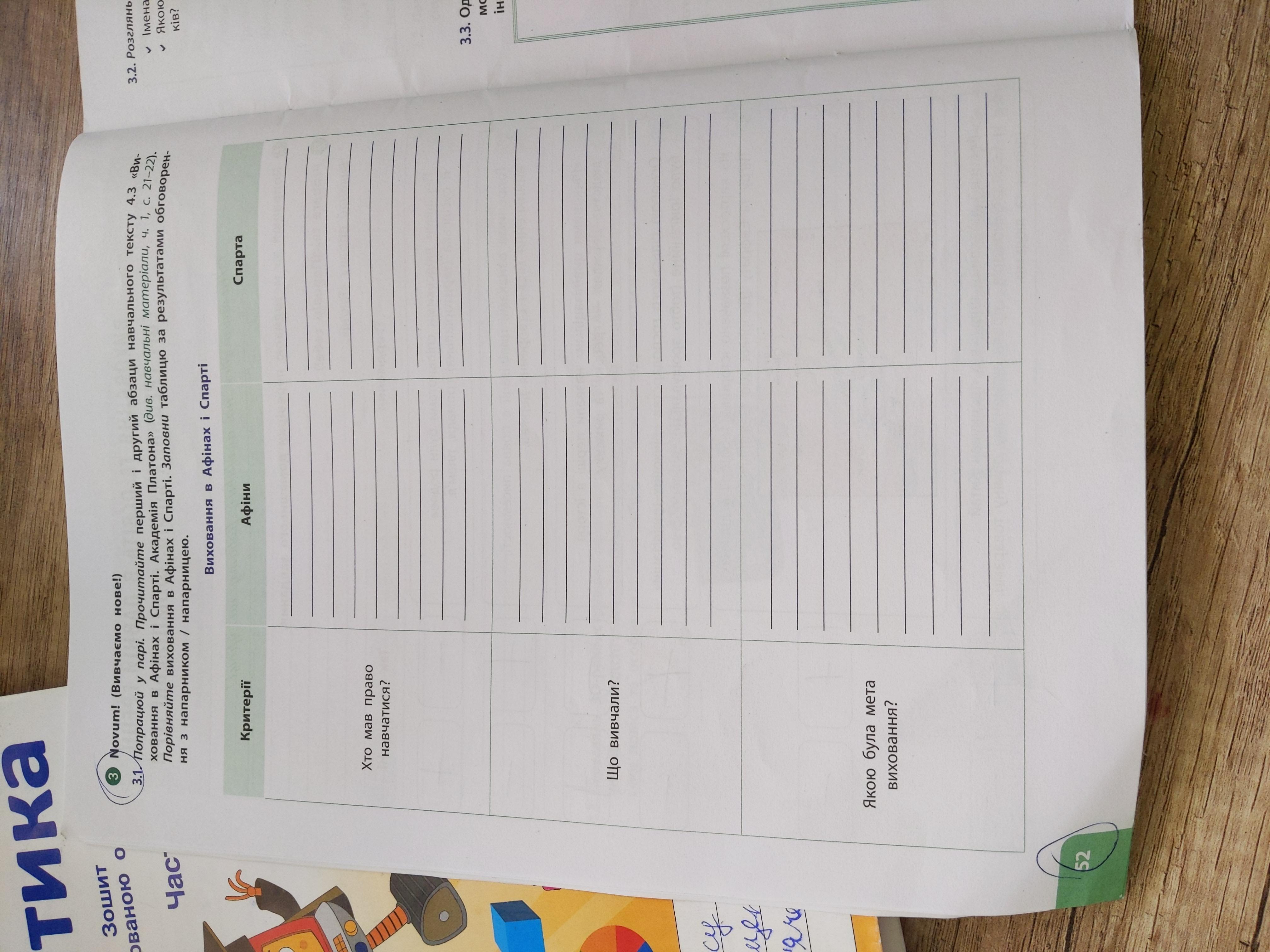 Novum! (Вивчаємо нове!) 3.1. Попрацюй у парі. Прочитайте перший і другий абзаци навчального тексту 4.3 «Ви- ховання в Афінах I Спарті. Академiя Платона» (див. навчальні матеріали, ч. 1, с. 21-22). Порівняйте виховання в Афінах і Спарті. Заповни таблицю за результатами обговорен- ня з напарником / напарницею. Критерії Хто мав право навчатися? що вивчали? кою була мета виховання? Виховання в Афінах і Спарті Афiни Спарта