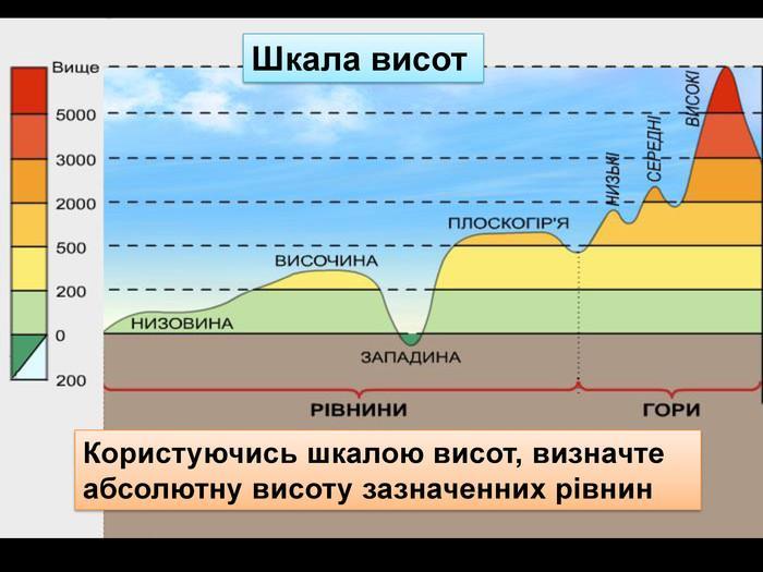 - Користуючись шкалою висот, визначте абсолютну висоту зазначенних рівнин.