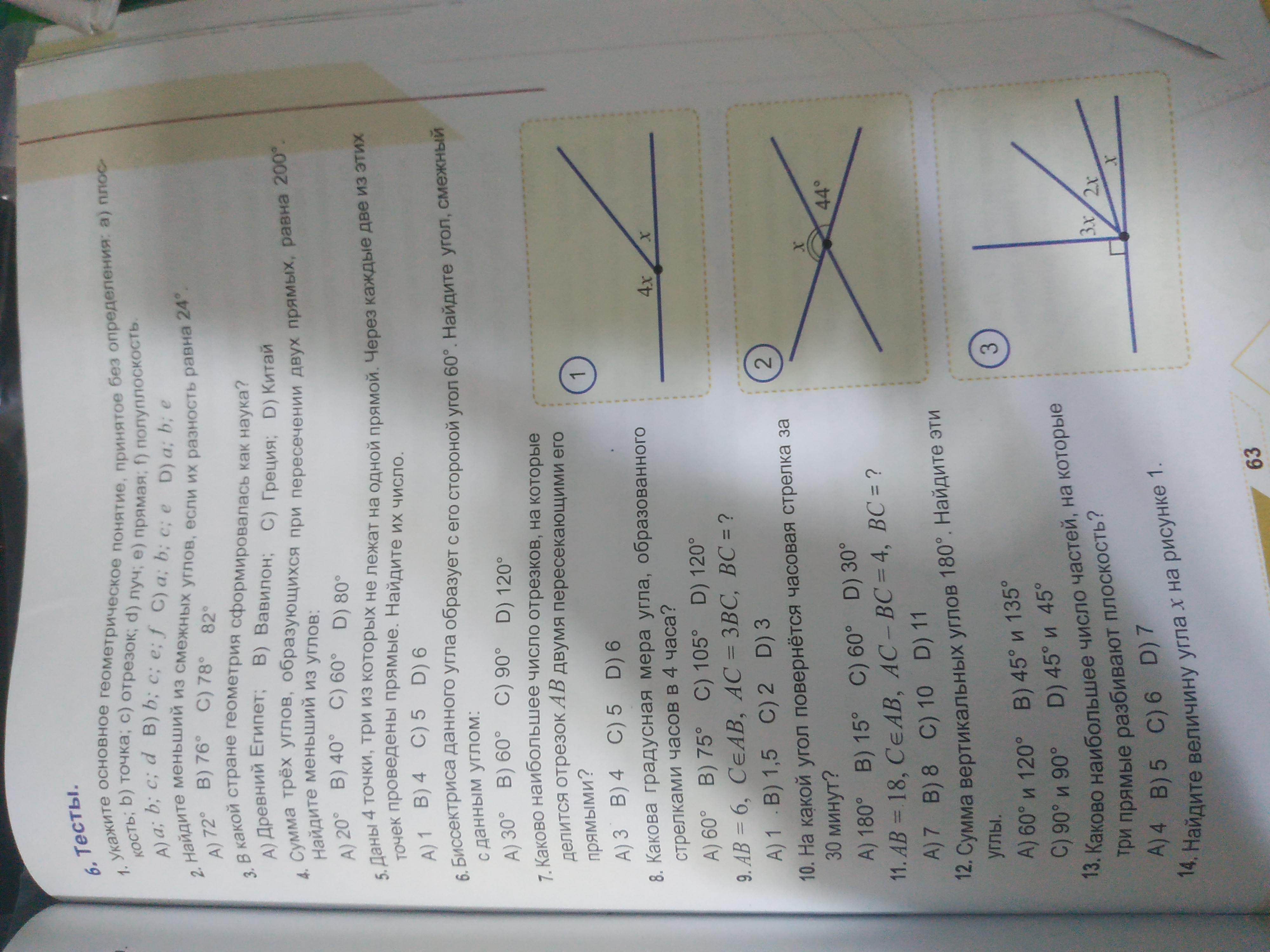 помогите с тестами даю 60 баллов 6. Тесты. 1. Укажите основное геометрическое понятие, принятое без определения: a) - кость; b) точка; с) отрезок; d) луч; е) прямая: 1) полуплоскость. A) a; b; c; d B) b; c; e: f c) a; b; c; е D) a; b; e 2. Найдите меньший из смежных углов, если их разность равна 24°. A) 72° B) 76° C) 78° 82° 3. В какой стране геометрия сформировалась как наука? А) Древний Египет; В) Вавилон; С) Греция; D) Китай 4. Сумма трёх углов, образующихся при пересечении двух прямых, равна 200° Найдите меньший из углов: A) 20° B) 40° C) 60º D) 80° 5. Даны 4 точки, три из которых не лежат на одной прямой. Через каждые две из этих точек проведены прямые. Найдите их число. A) 1 B)4 C)5 D) 6 6. Биссектриса данного угла образует с его стороной угол 60°. Найдите угол, смежный с данным углом: А) 30° В) 60° C) 90º D) 120° 7. Каково наибольшее число отрезков, на которые делится отрезок АВ двумя пересекающими его прямыми? А)3 В)4 С)5 D) 6 8. Какова градусная мера угла, образованного стрелками часов в 4 часа? A) 60° B) 75° C) 105º D) 120° 9. AB = 6, CeAB, AC = 3BC, BC = ? A) 1 . B) 1,5 C)2 D) 3 10. На какой угол повернётся часовая стрелка за 30 минут? A) 180º B) 15° С) 60º D) 30° 11. AB = 18, CeAB, AC - BC = 4, BC = ? = A)7 B)8 С)10 D) 11 12. Сумма вертикальных углов 180°. Найдите эти углы. А) 60° и 120° В) 45° и 135° C) 90° и 90° D) 45° и 45° 13. Каково наибольшее число частей, на которые три прямые разбивают плоскость? А)4 B)5 С)6 D) 7 14. Найдите величину угла х на рисунке 1. 63 1 2 3 4x Х X 44° 3x/2x X