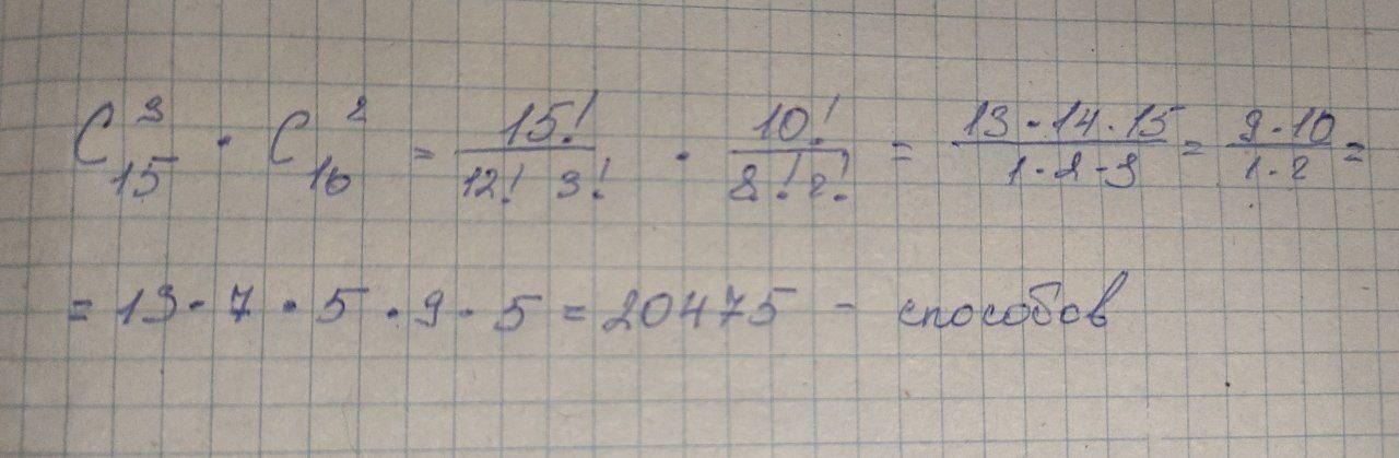4. В классе 15 девочек и 10 мальчиков. Сколькими способами можно выбрать дежурных, состоящих их трех девочек и двух мальчиков?